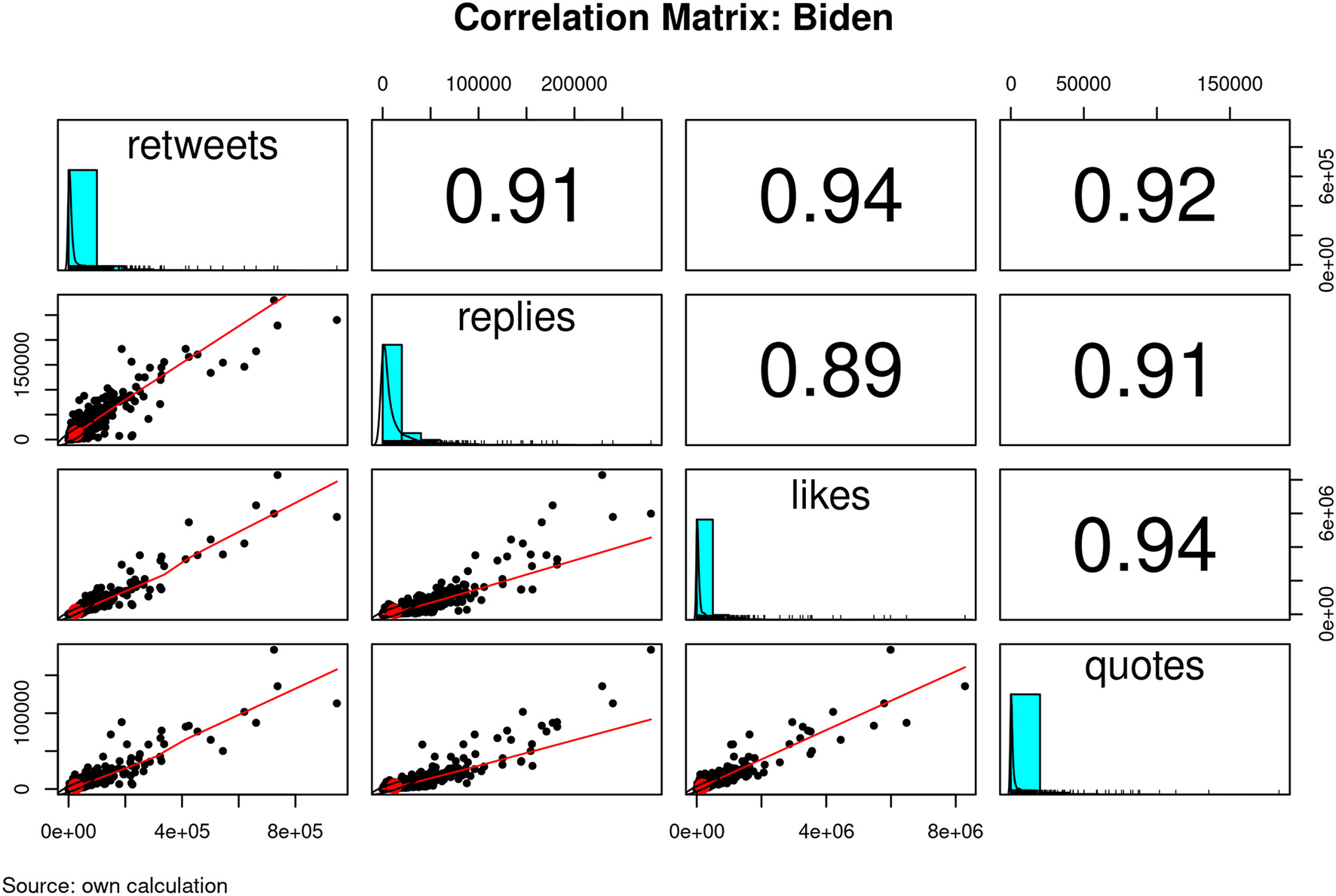 As will be discussed in the following sections, likes may be a good proxy for acclamation, but it is not the only one. The data that are available also entails information about retweets and quotes, which could be seen as alternative proxies for acclamation. To investigate if the selection of the dependent variable has a relevant effect on our results, we perform correlation analysis. As long as the possible dependent variables are highly correlated, the results will not change much.