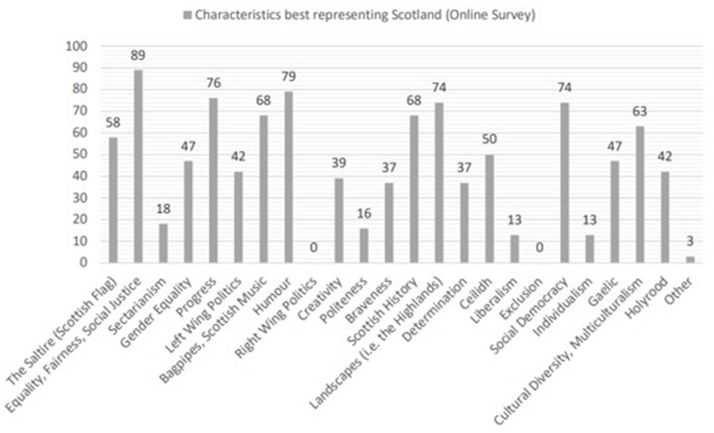 Some of the young interviewees talked about culture but it was not the majority of them. More particularly, some insisted that it is social-democracy and progress which symbolize Scotland,8 as well as living in Scotland, not stereotypes or clichés about Scotland. Liam said: “Scottishness is not really bagpipes, haggis. It's more personal. When you come to Scotland, you're Scottish.” Here, the civic characteristic of Scottish identity is clear.