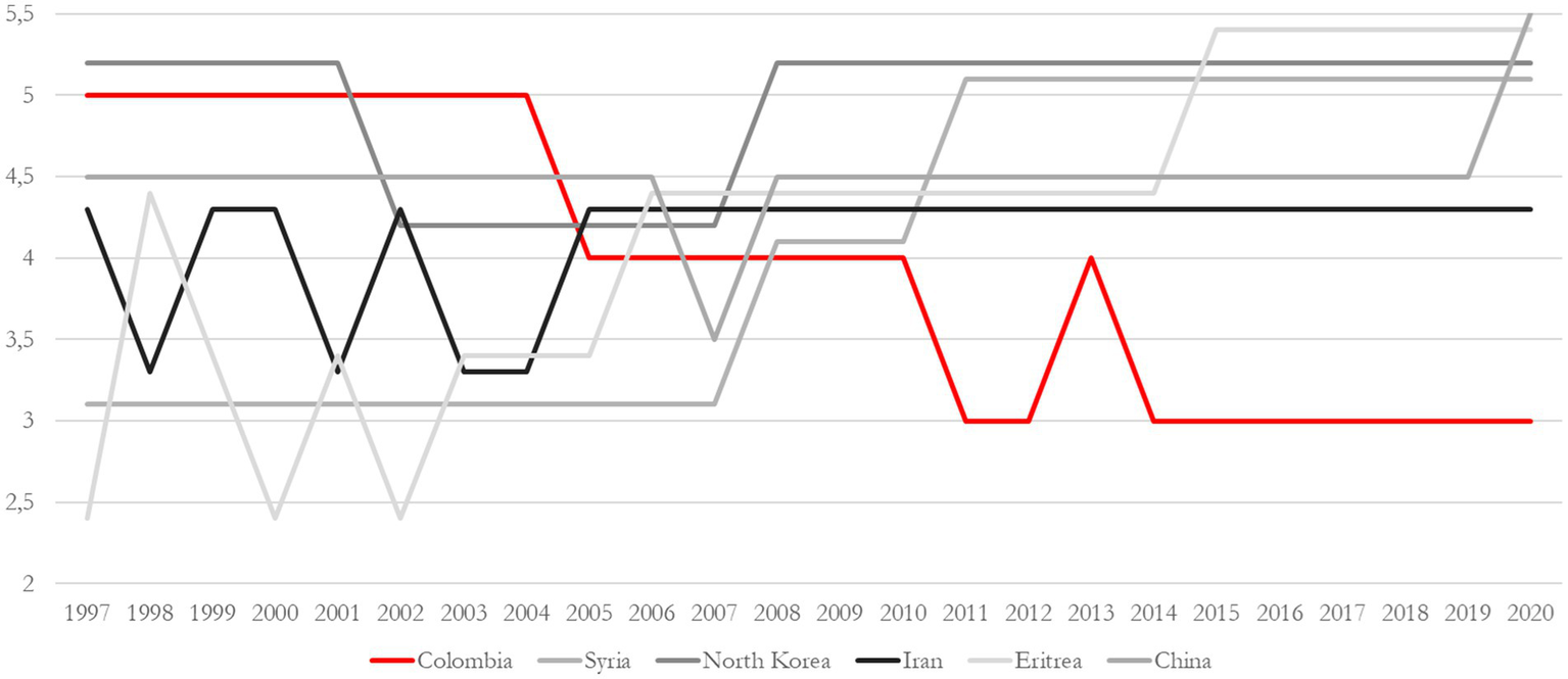 The relationship between political violence and the type of political regime has often been depicted as following an “inverted-U” pattern (Hegre et al., 2001). However, it is not always the case that political violence in hybrid regimes is higher than in extreme regimes (Sambanis, 2001; Vreeland, 2008; Peic and Reiter, 2011). Colombia can be characterized as a hybrid regime and has historically experienced endemic political violence. The country has had periods of extreme violence, such as during 1997–2004, as well as periods of relative calmness (2011–2020), during which its levels of violence have been lower than those observed in the autocratic regimes presented in Figure 1.
