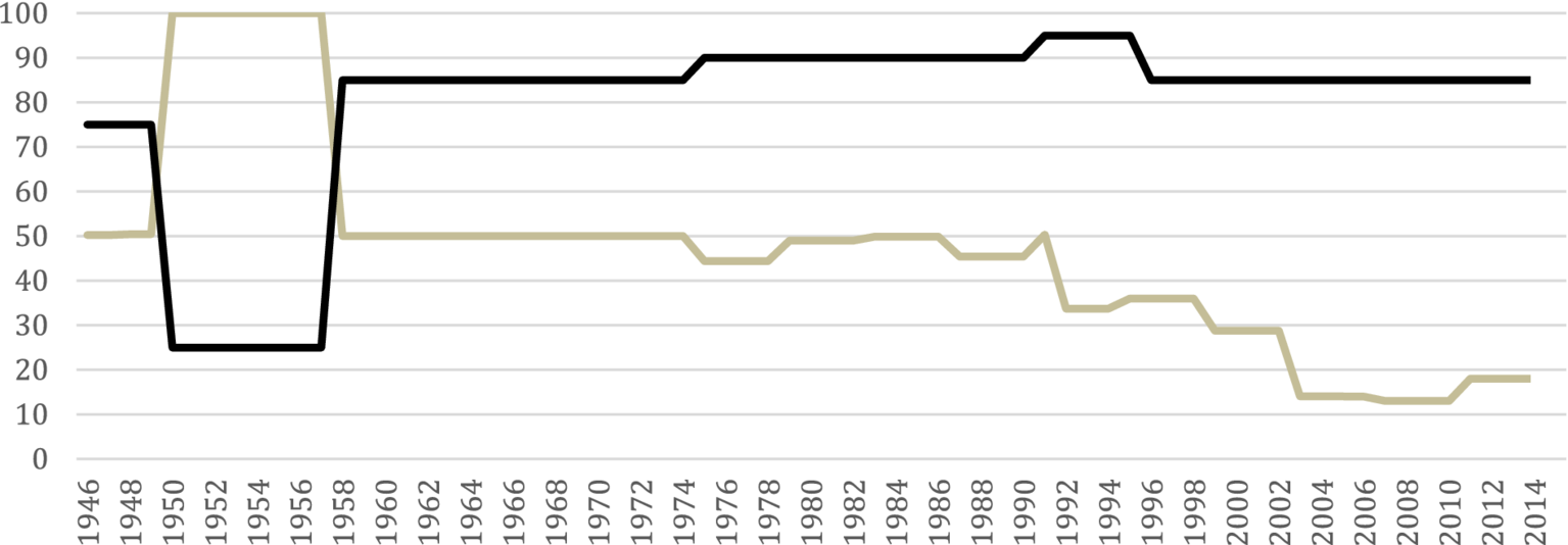 | 1947 | 12 | 50 | −1 | 75 | 1965 | 32 | 50 | 3.60 | 85 | 1983 | 32 | 50 | 1.57 | 90 | 60 | 2000 | 63 | 29 | 2.92 | 85 | 100 | |