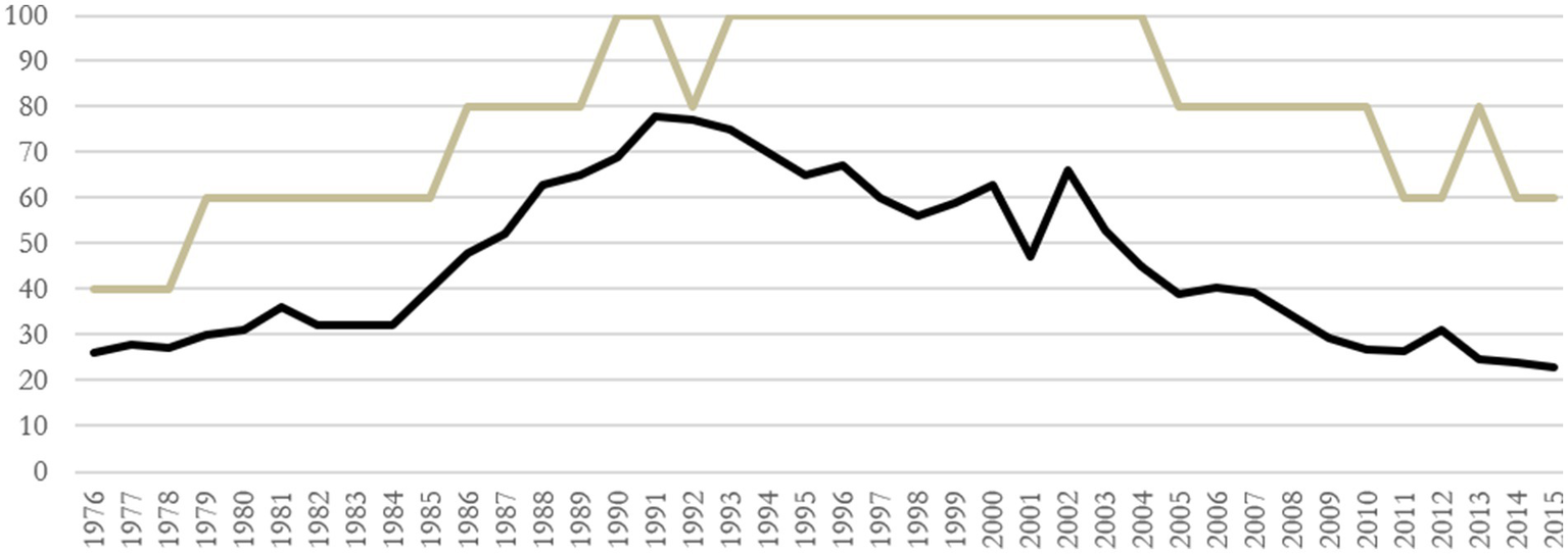Indexes of political violence (political terror scale) and homicidal violence in Colombia. Source: prepared by the authors. The dark line corresponds to the violence index series and the clear line to the political terror scale series.