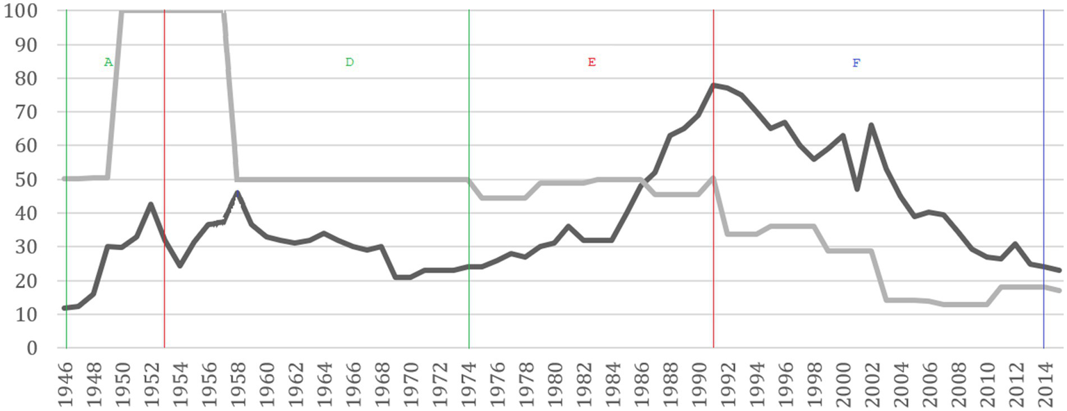 Time series of the indexes of democratization and concentration of political power in Colombia. Source: prepared by the authors. The dark line corresponds to the D democratization index time series and the clear line to the PPC index time series.