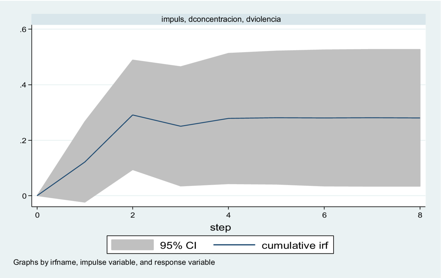The narrative and the analytical narrative indicate that, in a hybrid regime, a higher degree of political power concentration causes a higher rate of political violence. The estimation of the Vector Auto-regression model allows us to analyze the response of the violence rate to a shock in the concentration index. Following an unexpected increase in the concentration of political power, the violence rate shows an initial increase of approximately 0.3 percentage points above its initial value. Subsequently, the effect attenuates slightly and stabilizes at around 0.2 percentage points above the baseline, maintaining this level throughout the period.