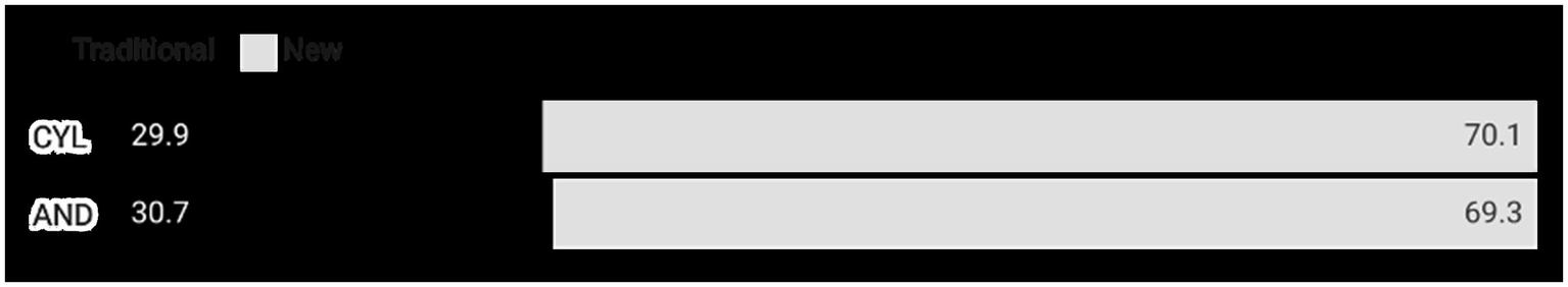 The initial observation is that, in contrast to the findings of Pérez-Castaños et al. (2023) regarding the Facebook and X accounts of political parties, where over 80% of the content featured the leaders, when solely the accounts of the candidates are examined, this percentage declines significantly. As was the case in Figure 1, the data in Figure 2 demonstrate comparable trends based on region. The key differentiating factor is whether the parties in question are new or traditional. In both cases, a difference of approximately 20 percentage points is observed in favor of the new parties, with the presence of leaders accounting for approximately 60% of the analyzed content. This challenges the prevailing trend in the literature towards hyper leadership (Pérez Curiel, 2020; Pereira et al., 2021) and demonstrates that the role of the leader is more significant in new parties than in traditional ones.