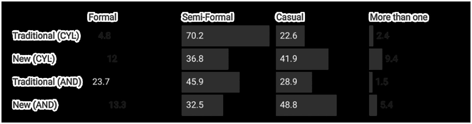 Prior to commenting on the data, it is important to note that the coding was conducted based on four distinct categories of attire. These correspond to the following categories: The “formal” category encompasses individuals attired in a jacket and tie, a jacket and blouse/shirt, and the absence of cotton garments, neutral colors, and other characteristics. The “semi-formal” category includes individuals attired in a jacket without a tie, a shirt or blouse without a jacket, and the absence of cotton garments, neutral colors, and other characteristics. The “casual” category includes individuals who do not wear a jacket or tie or who wear brighter colors, among other characteristics. The “more than one attire” category includes individuals who appear on the poster in different attire. Given the differences in attire between men and women, these categories are designed to be as comprehensive as possible.