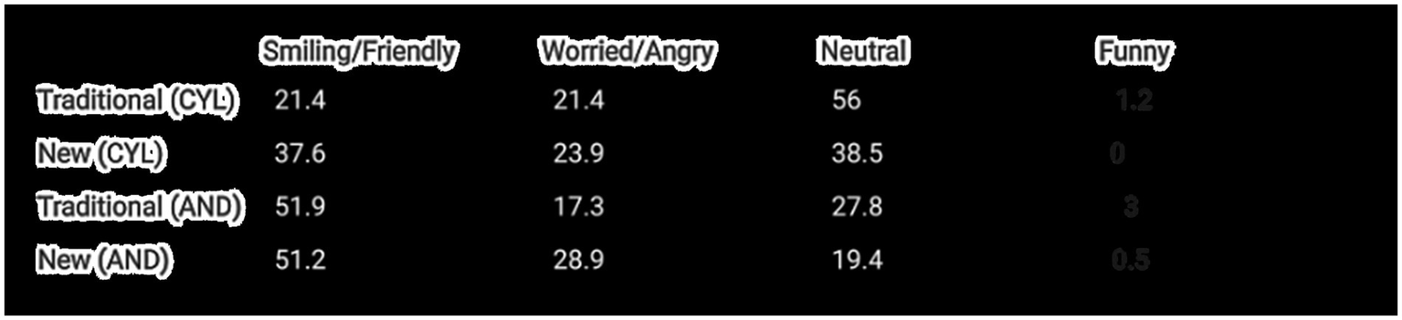 Given the clear distinction between the candidates of the new and traditional parties as evidenced by the data in Figure 1, it is now appropriate to begin an examination of the elements analyzed to respond to our hypotheses. The initial focus will be on the aspects of leadership pertaining to appearance, image, and expression. Subsequently, an investigation will be conducted into the nature of the content posted, specifically whether it is negative or satirical in tone. Finally, the presence of emotional and rational content in the leaders’ posts will be analyzed.