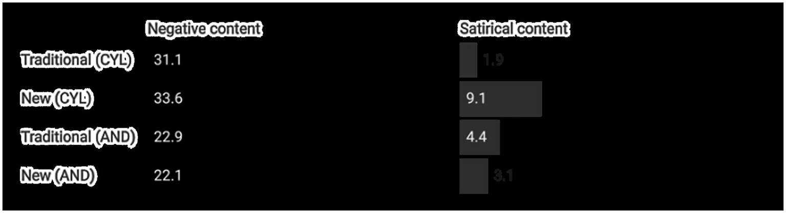 This section will be divided into three distinct sections, each with a particular focus on a specific issue. However, before undertaking an analysis of the issues, it is first necessary to present the content published by each of the party types on the X social network. Figure 1 illustrates that, of the total number of materials analyzed for each of the Autonomous Communities, more than two-thirds have been posted by new parties. This figure is 70.1% for Castilla y León and 69.3% for Andalucía.