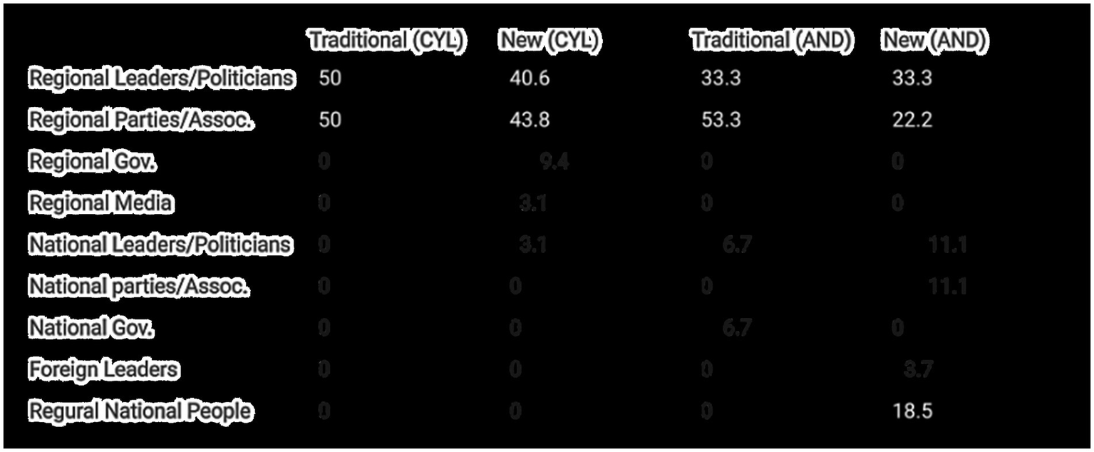 In the context under examination, the distinction between traditional and new parties is clearly delineated. Accordingly, the accounts of the leaders of the PSOE and the PP in both Autonomous Communities, as well as that of the UPL party in Castilla y León, which was established in 1986, will be classified as “Traditional Parties.” In contrast, the remainder of the parties will be designated as “New Parties,” given that they all emerged after the Great Recession and have since established a robust electoral presence in the second decade of the 21st century.