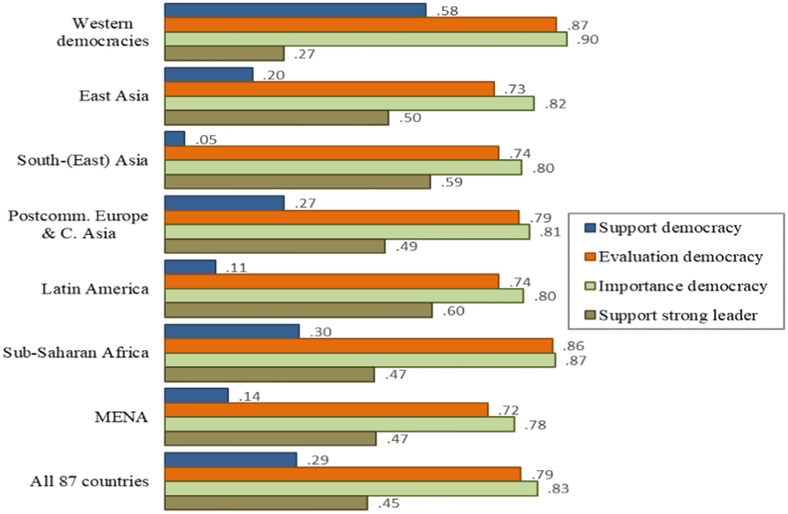 Support for democracy, evaluation of democracy, the significance of living in a democracy, and backing for a strong leader who is not required to engage with parliament and elections by world region (wave 2017–2020 only). Source: IVS 1981–2020, 87 countries, equilibrated weight, wave 7.