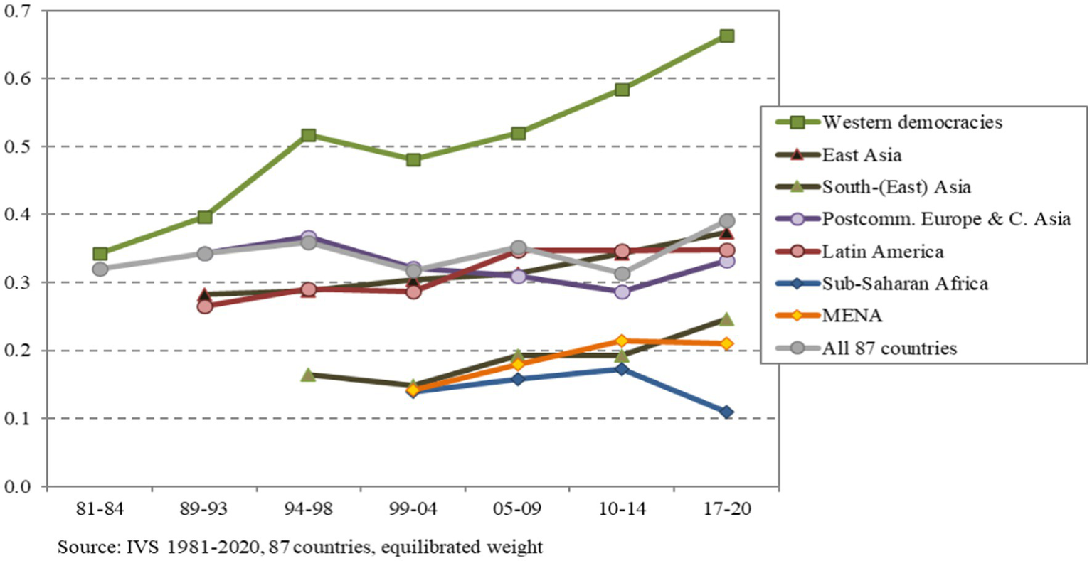Once again, the increase is most pronounced in the established Western democracies; however, a noticeable overall increase is also observable in the countries represented by 87 IVS that have longitudinal data (indicated by the gray line).