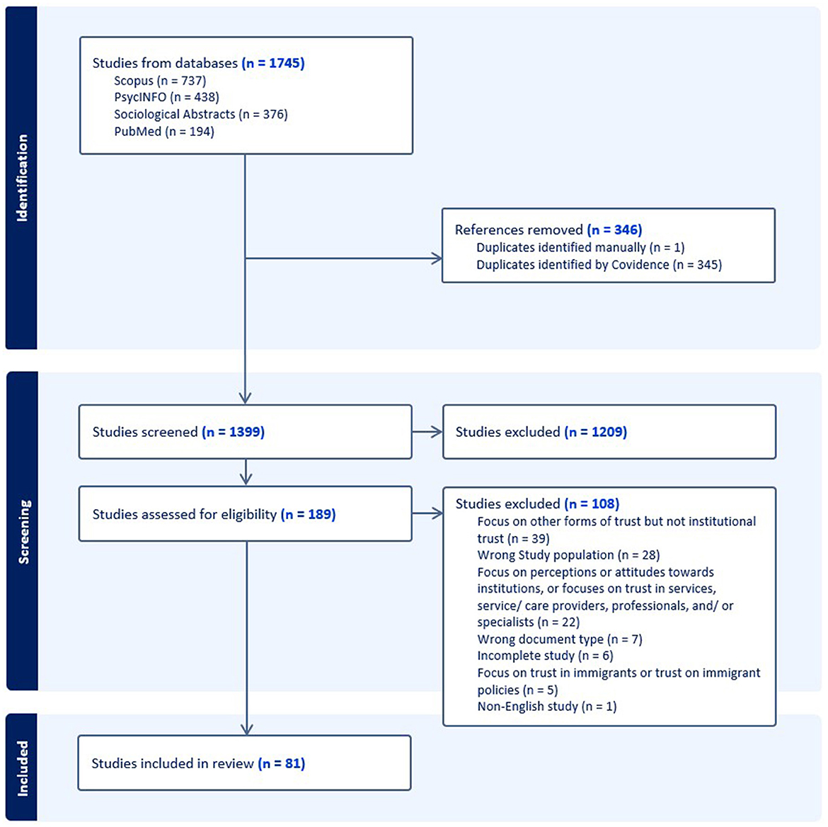 Flowchart depicting a systematic review process. It starts with 1,745 studies identified from databases: Scopus (737), PsycINFO (438), Sociological Abstracts (376), PubMed (194). After removing 346 duplicates, 1,399 studies are screened, with 1,209 excluded. Then, 189 studies are assessed for eligibility, and 108 are excluded for various reasons, such as wrong study population, focus, or document type. Finally, 81 studies are included in the review.