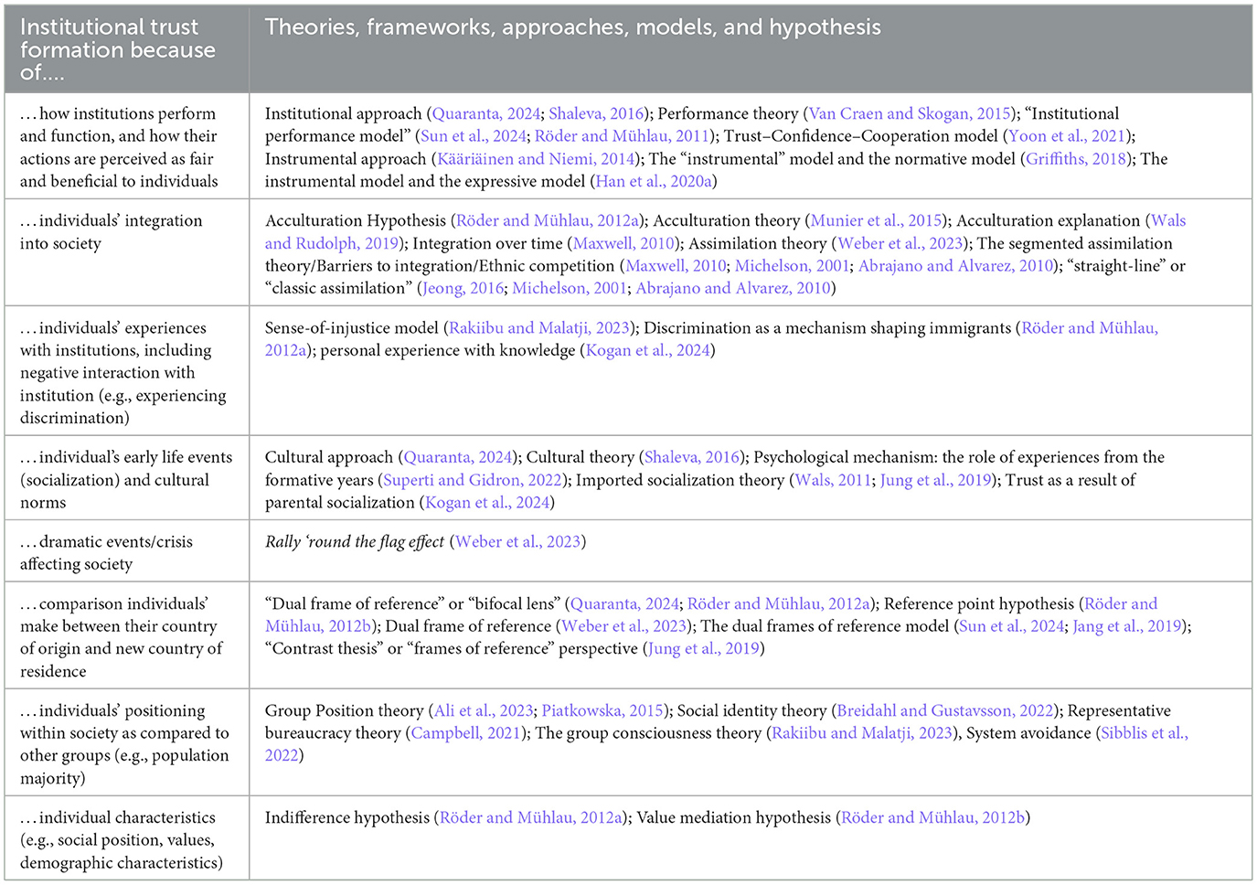 The most prominent theories are presented in Table 1. These theories showed up multiple times across various studies, despite differences in population groups, institutions, and contexts of the host and original countries, as were group based on how they explained institutional trust formation. These are important considerations not only to understand trust, but also when developing strategies to (re)build institutional trust of immigrants, migrants and refugees. For more details on these and other less prominent theories, please see Extraction Table 3 in Supplementary material.