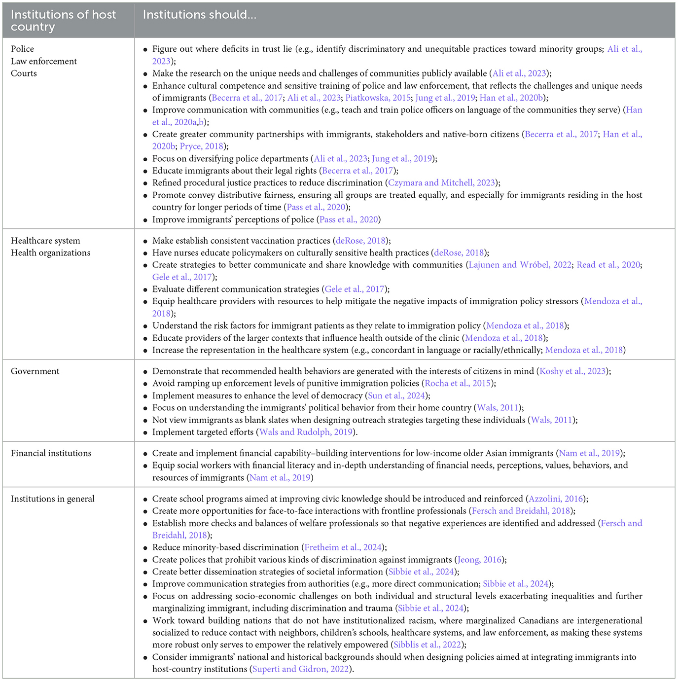 Only one of the studies that provided recommendations focused on refugees (Hall and Werner, 2022), while all others focused on migrants and immigrants. Despite the inclusion of studies focusing on different migrants and immigrants from different countries of origin and different host countries, recommendations across the papers acknowledged a lack of knowledge and understanding of the needs of the populations (i.e., immigrants and migrants) that institutions are serving, as well as lack of involvement with the same. This information is presented in Table 2, where recommendations are organized by the institution of focus. For more details on these, please refer to Extraction Table 3 in Supplementary material.