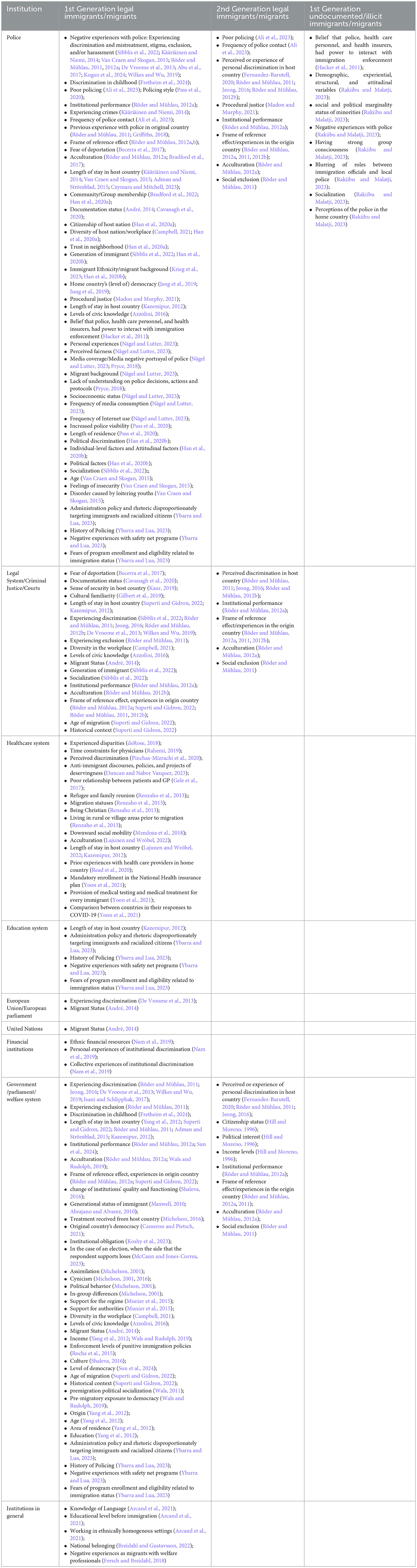 Table 3. Factors and/or variables impacting institutional trust (or adjacent concepts) organized by institutions, generation and immigration status.