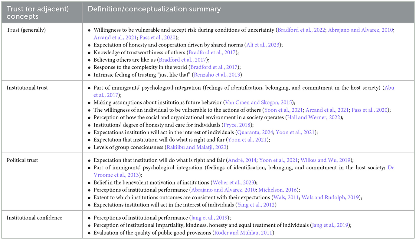 This objective relates to how trust in institutions is defined for immigrant, migrant and refugee' groups. Despite the focus on institutional trust (or adjacent concepts), only a handful of studies (n = 27) explicitly defined the concept of focus for their readers in the background or theoretical section of their paper, and even fewer explicitly identified the dimensions of the studied/measured concept (n = 8). This is problematic when considering that how trust is measured and conceptualized can impact how trust interventions are developed and their success measured. Understanding how trust is defined or conceptualize may inform future items in trust measures, which can be tailored to immigrant and migrant population groups. Table 4 presents a summary of the definitions and conceptualizations of trust and adjacent concepts across included studies. To see the full definitions, see Extraction Table 2 in the Supplementary material.