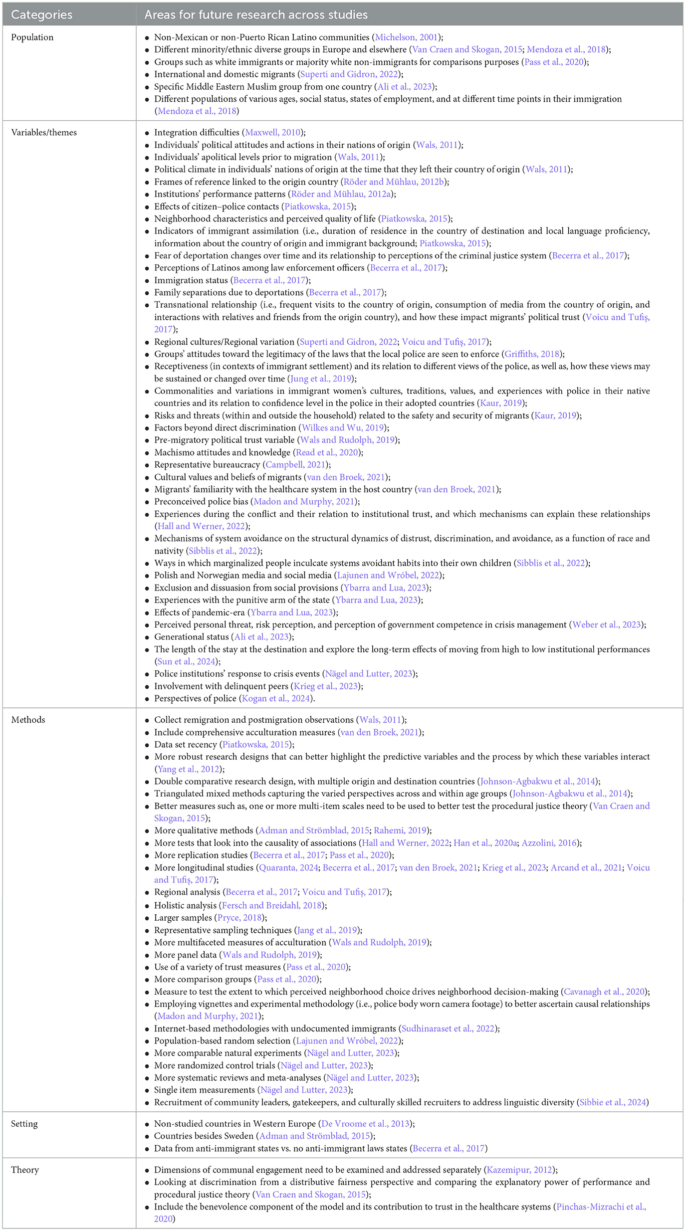 Many of the factors we listed in Table 3 for 2nd generation immigrants are also listed for 1st generation immigrants. This may suggest that the difference in trust between these two groups may not be because of different issues, challenges and barriers, but rather, in the degree (or level) to which these factors matter to the two generations. Differences across institutions and how much different institutions matter to different generation of immigrants (or play a role in the lives of individuals), may also be at play here. For instance, one study suggests that immigrants' overconfidence is somewhat less pronounced for the police than for the legal system, and that the lower trust of the second generation is also more strongly observed for the police (Röder and Mühlau, 2012b). There is also some overlap of factors with 1st generation undocumented/illicit immigrants/migrants, such as negative experiences with police (Rakiibu and Malatji, 2023), also suggest some overlap between the groups. However, we also note some more unique factors such as, the belief that representatives of institutions have the power to interact with immigration enforcement (Hacker et al., 2011), group consciousness (Rakiibu and Malatji, 2023), and blurring of roles between immigration officials and local police (Rakiibu and Malatji, 2023), and how these seem to relate to situations where their residence and safety within the country are at risk from interactions with immigration officers and law enforcement, directly relating to their precarious legal status.