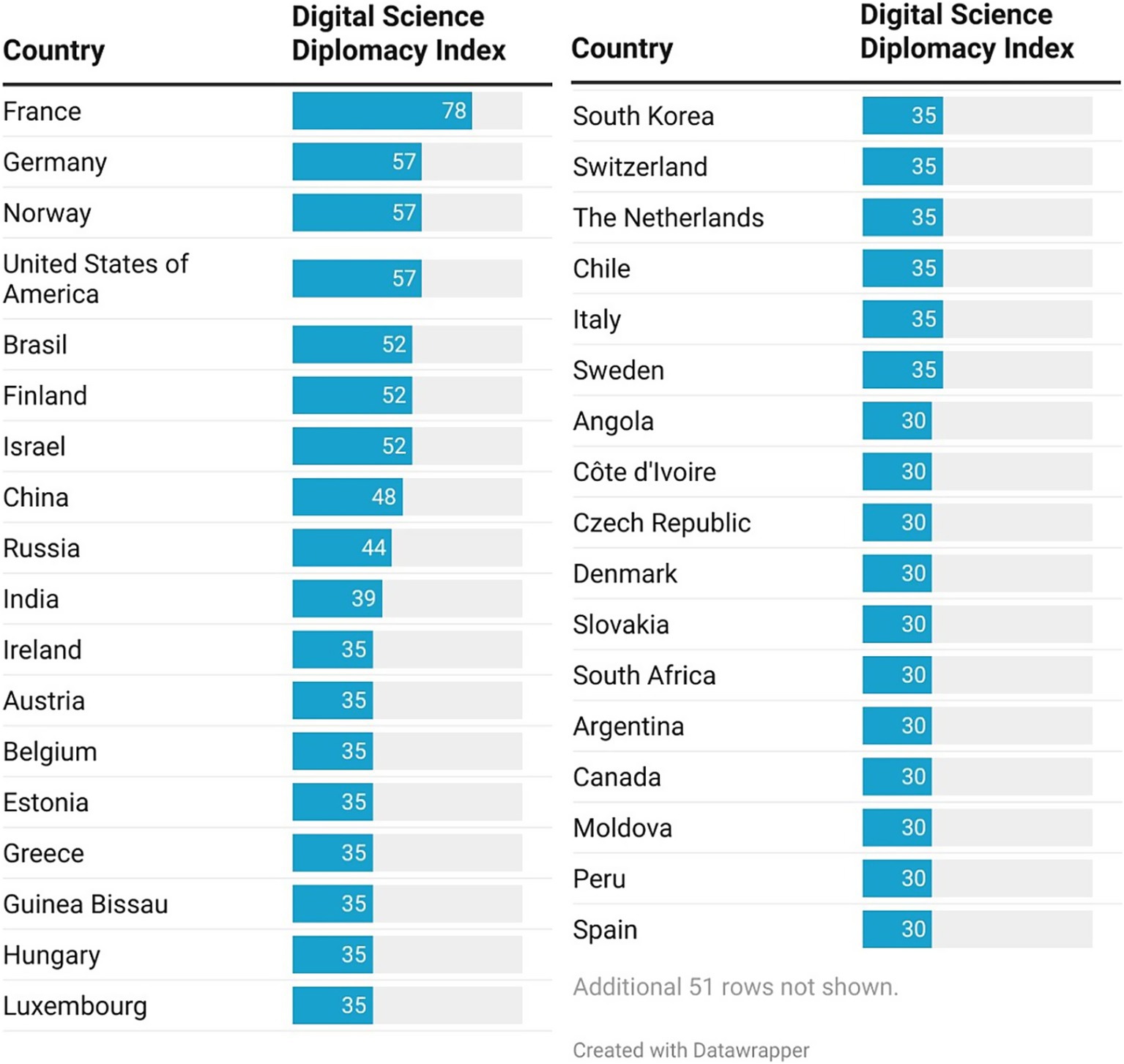 When considering only the number of science diplomacy practices featured on websites, the top “performers” were France (with 5 practices), Brazil, China, Finland, Germany, Israel, Norway and the United States of America (with 4 practices). Countries with 4 practices stated to have either an attaché or a profit/non-profit science representation, and France, with 5 practices, stated to have both. Identified practices imply very different levels of engagement by stakeholders. Indeed, the presence of a science attaché or of science representations requires a significant investment over simply publishing news about activities and events related to S&T or posting about S&T in social media. To encompass all different activities in one indicator, a new index, designated as a “Science Diplomacy Digital Index” (SDDI) was created. This index results from a weighted sum of all the stated practices in websites and social media for the missions with resident representatives in Lisbon, which is then normalized for the total possible practices (as detailed in section 2). Results are shown in Figure 6, with the top 10 performers including France (index of 78), Germany, Norway and the United States of America (all with 57), Brazil, Finland and Israel (all 52), China (48), Russia (44), and India (39).