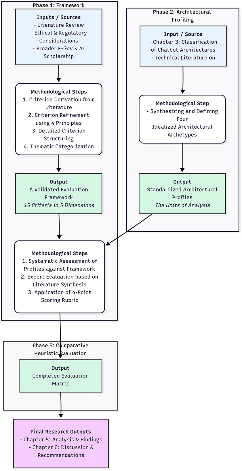 To address the research gap, we developed and applied a multi-stage comparative analytical methodology designed to systematically evaluate the four primary chatbot architectures focusing particularly on the needs, particularities and use cases of public administration. This targeted approach ensures that the proposed framework not only evaluates the operational performance of chatbot architectures, but also their alignment with values and ethical standards for the provision of public services, providing guidance toward robust, citizen-focused AI deployments. The methodology was executed in three distinct phases, as illustrated in Figure 1.