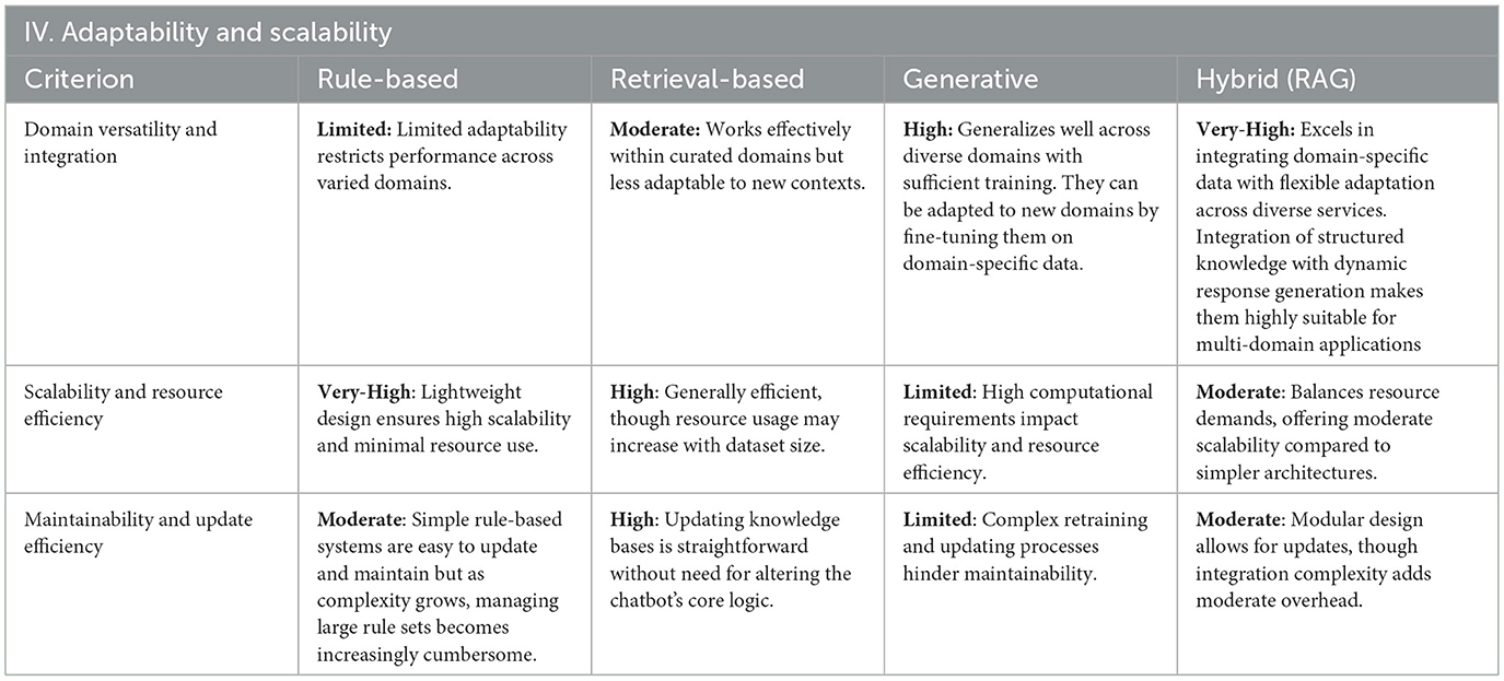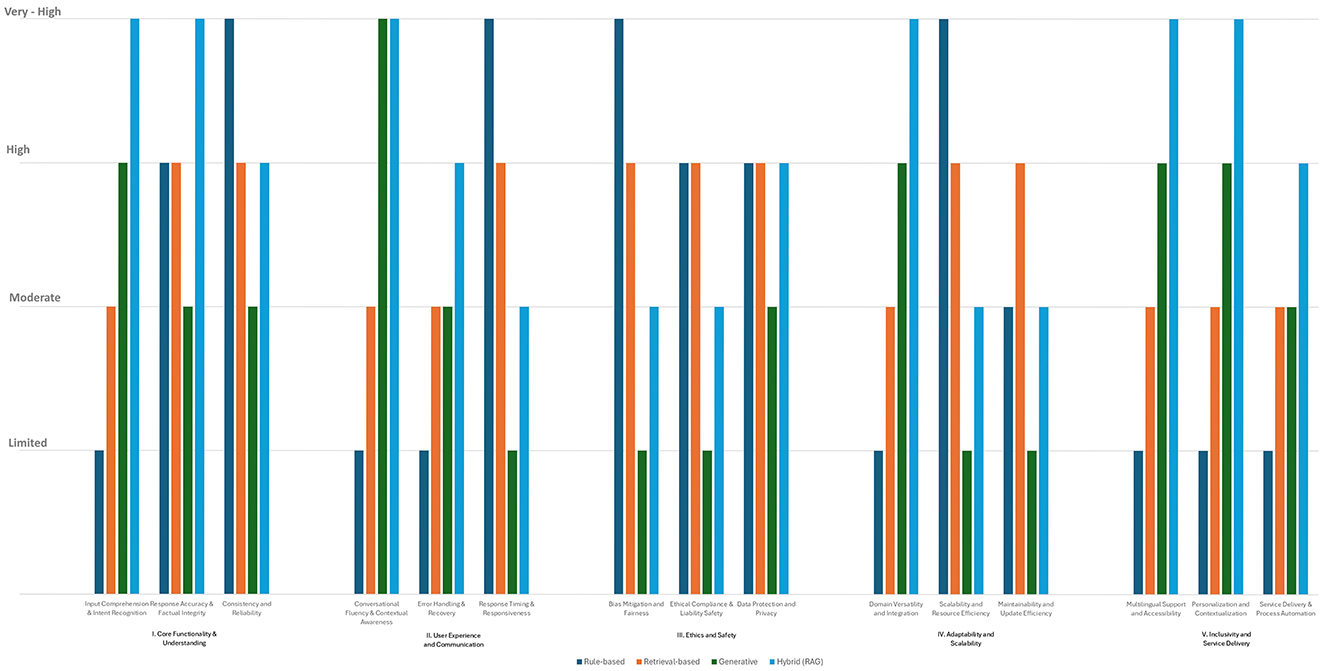 Another limitation lies in the reliance on theoretical analysis and simulated scenarios for independent criteria evaluations, which introduces a degree of subjectivity in the results. The assignment of qualitative values (Limited to Very High) is based on expert judgment and the interpretation of available evidence and is using an average “typical” system as a baseline reference for each chatbot architecture, ignoring variances, sub-categories or specialized implementations. Subsequent research should explore the development of more specific, objective and quantitative metrics to enhance the assessment of chatbot performance.