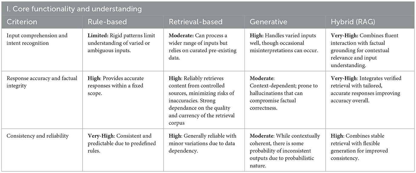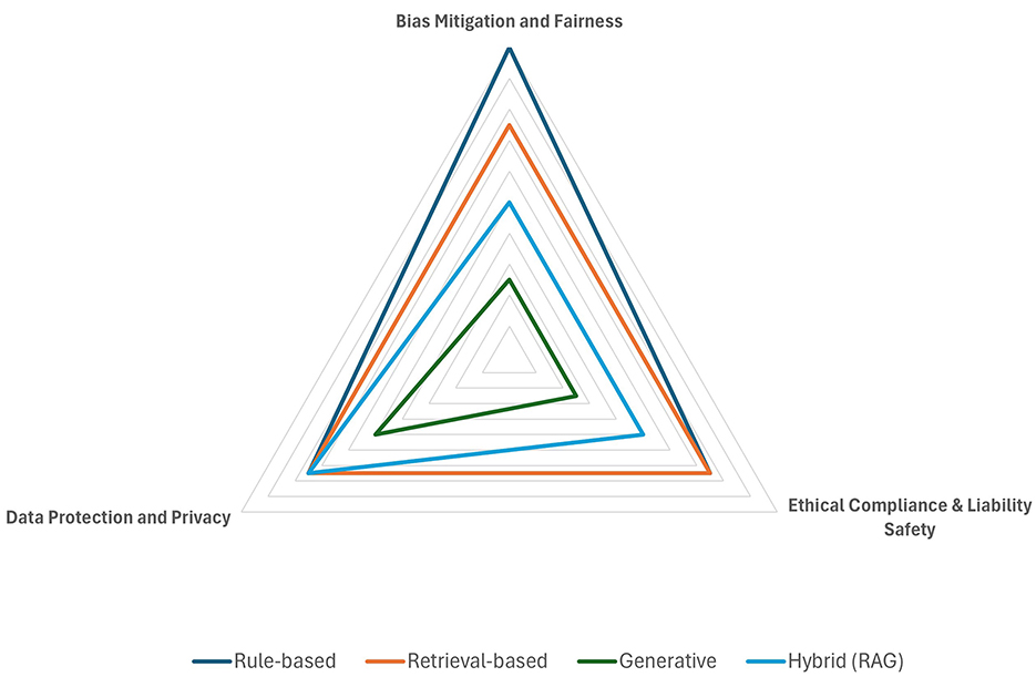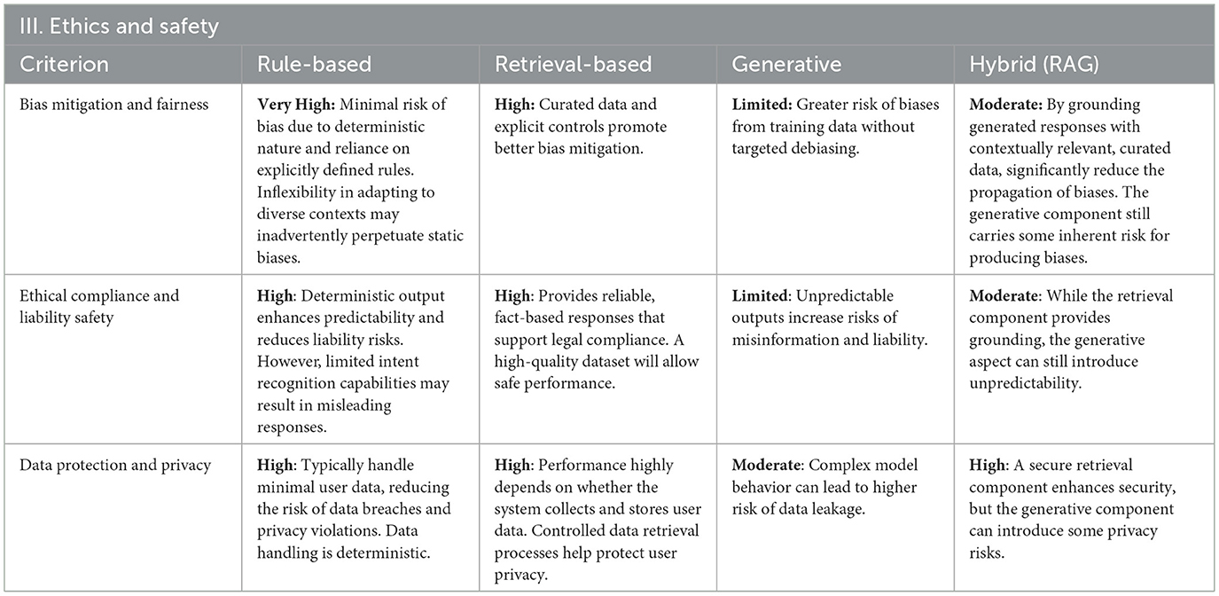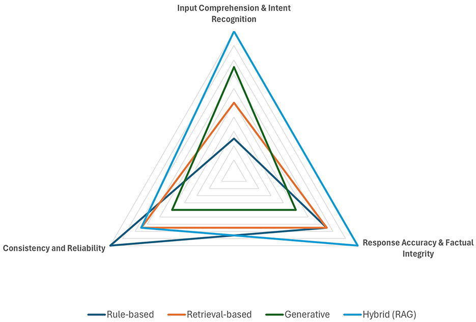 1. Evaluation process: The scoring was conducted through an expert evaluation, based on a comprehensive synthesis of the evidence presented in the literature review. For each criterion, we assessed the inherent capacity of each architecture to meet its demands. The judgment was based not on a single implementation but on the documented potential and systemic risks associated with each architectural approach. For instance, the scoring for “Response Accuracy” considered both the high risk of hallucination in pure generative models (Dahl et al., 2024) and the documented mitigation effect of RAG architectures (Vemulapalli, 2025).