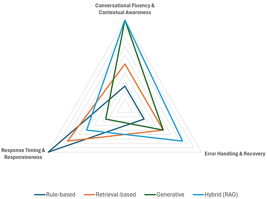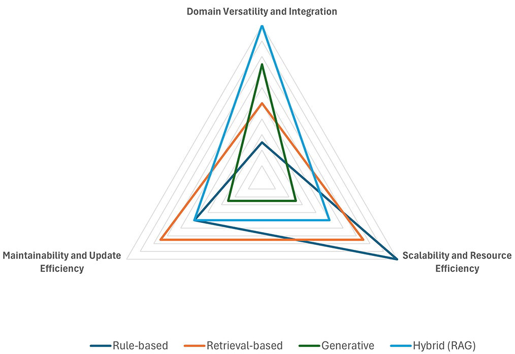 To ensure a fair and consistent comparison, we first established standardized, idealized profiles for each of the four architectures, as detailed in Section 3. Without this architectural profiling, the research would be vulnerable to a major methodological flaw: comparing idiosyncratic, real-world implementations that have too many confounding variables. These profiles—Rule-Based, Retrieval-Based, Generative, and Hybrid (RAG)—served as the consistent units of analysis for the evaluation. Each profile was defined by a consistent set of five core characteristics derived from the technical literature: