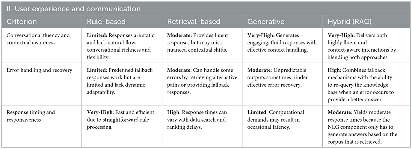 While accuracy and reliability define the baseline for performance, literature consistently shows that user perception and trust ultimately determine whether such systems succeed in practice. Beyond functional performance, the success of a digital government service is contingent on public trust and a positive user experience. A seminal experimental study by Aoki (2020) directly investigated the drivers of initial public trust in government chatbots. Her research revealed that trust is highly context-dependent, with the public showing significantly less trust in chatbots for service areas requiring empathy and complex situational judgment, such as parental support, compared to more procedural tasks like waste separation. This crucial finding empirically demonstrates that “performance” in the public sector is judged not only on technical accuracy but also on the perceived ability to handle nuanced human needs. Furthermore, Aoki's discovery that communicating citizen-centric purposes—such as ensuring “uniformity in response quality” or “24-h, 365-day, timely responses”—measurably enhances public trust, even if the effect sizes are small, provides a direct link between strategic communication and user acceptance. These findings are consistent with research by Abbas et al. (2023), which highlights the importance of clarity and effective error recovery, and shows that government chatbot users demand not only efficiency but also trustworthiness, ease of use, and nuanced conversation handling. They report that a positive user experience “is heavily dependent on the chatbot's ability to provide clear, understandable responses and to offer effective recovery mechanisms when errors occur”. Recent experimental work reinforces this: Zhou et al. (2025) find that empathetic chatbot communication significantly enhances user trust and satisfaction in digital public services. In short, peer-reviewed evidence shows that fluent, context-aware dialogue and robust recovery from misunderstandings are essential for user satisfaction, and thus must be explicitly evaluated for the selection of chatbot architecture. These insights motivate our User Experience and Communication category, which includes criteria like Conversational Fluency (grammatical, coherent responses), Error Handling and Recovery (fallbacks and clarification), and Response Timing (speed and consistency).