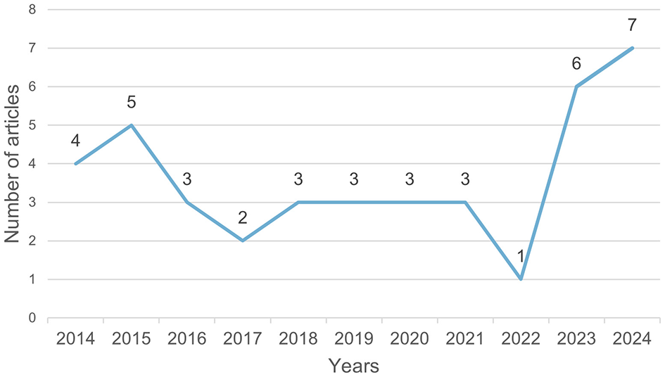 As shown in Figure 2, there was a fluctuating yet increasing number of empirical studies on NGOs' global climate action over the years from 2014 to 2024, indicating a growing interest in NGOs among global climate governance scholars. It goes with greater recognition of NGO influences in the global climate governance architecture amid pressing climate challenges. Specifically, the past 2 years have seen a sharp rise in publications, peaking at seven studies in 2024. This recent growth coincides with major institutional and political developments, including the operationalization of Paris Agreement mechanisms such as the Global Stocktake, and heightened attention to climate finance instruments such as the Fund for Responding to Loss and Damage (FRLD; UNFCCC, 2022, 2023, 2024a). Compared to earlier fluctuations, this surge appears more sustained, marking a potential shift in the academic agenda toward systematic examination of NGO action in global climate governance.
