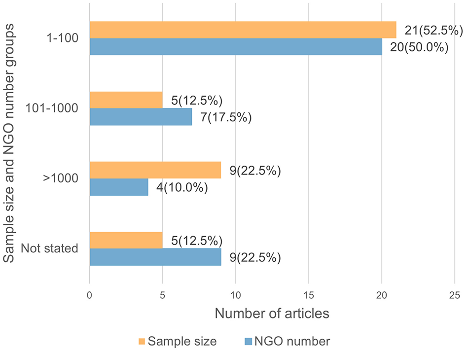 Similar to sample size, most studies (50.0%) analyzed fewer than 100 NGOs (Figure 5). However, the number of NGOs considered did not always match up with the sample size. The second-largest group of studies (17.5%) examined between 101 and 1,000 NGOs. This discrepancy may partly reflect cases where NGOs were not the primary unit of analysis, or where samples included other entities such as interviewees (Luhtakallio et al., 2022; Szarka, 2014), development projects (Davila et al., 2024), and country-diad-year statistics (Böhmelt et al., 2014). In addition, 12.5% of studies did not specify their sample size while a higher proportion (22.5%) failed to report how many NGOs were examined in their studies. These reporting omissions may reduce the transparency of existing research and complicate cross-study comparisons.