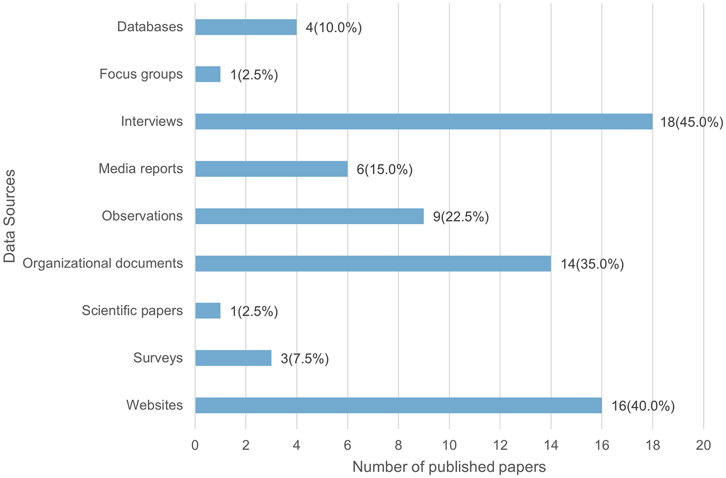 With regard to data collection (Figure 7), interviews were the most frequently used data sources (45.0%), followed by organizational websites (40.0%), organizational documents (35.0%), and observation (22.5%). Though less common, media reports (15.0%) and databases (10.0%) were also important data sources in the reviewed studies. It should be noted that a vast majority of the studies employed multiple data sources. For example, McGregor et al. (2018) collected data from Intended Nationally Determined Contributions, NGO websites, email correspondence with NGO staff and media reports, to explore how local NGOs in Climate Vulnerable Forum member countries created new knowledge and understanding and contributed to climate adaptation action within the broader context of global climate governance.