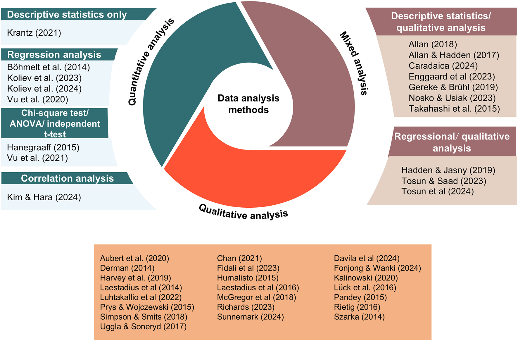 As regards the data analysis methods (Table 2), qualitative techniques were the predominant approach, employed in 80% of the studies while quantitative analysis methods were also used in 45.0% of the cases. It should be noted that these percentages are not mutually exclusive, as 10 studies (25.0%) adopted a mixed-method that combined both qualitative and quantitative techniques (Figure 8). Among studies that applied quantitative analysis methods, inferential statistics (25.0%) were slightly common than descriptive measures (20.0%), with regression the most frequently employed technique.
