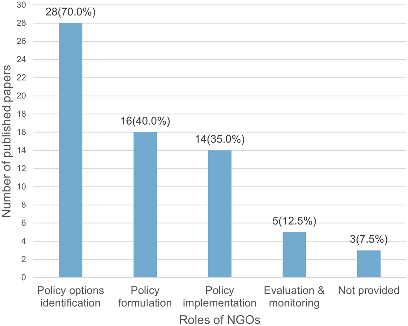 In terms of the roles that NGOs played in global climate governance, their activities are concentrated in the early policy stages, notably option-identification and formulation, while their engagement in later stages, such as evaluation and monitoring, remains comparatively limited. The majority of the studies (70.0%) revealed NGO involvement in identifying policy options, like issue-framing and lobbying (Figure 10). For example, Allan and Hadden (2017) investigated how a strategy shift among NGOs to justice-based framing enhanced their mobilization effects, thereby bolstering their influence on global governance outcomes. The second most frequently identified role, observed in 40.0% of the reviewed studies, was related to policy formulation. In this capacity, NGOs might participate in national delegations (Böhmelt et al., 2014) or assist governments to prepare for NDC reports (Allan, 2018). Thirdly, NGOs were also involved in policy implementation (35.0%). For example, Harvey et al. (2019) explored how NGOs contributed to data collection, technical analysis, and local engagement within the climate services sector in sub-Saharan Africa. Lastly, NGOs were also shown to have played a part in policy evaluation and monitoring (12.5%). One such example is found in Richards's (2023) study, in which the Oakland Institute ran a shocking investigative exposé to uncover the devastating impact of plantations on both local communities and the environment. This imbalance is likely indicative of NGOs' comparative advantages in advocacy and framing, alongside structural barriers to sustained involvement in long-term oversight.