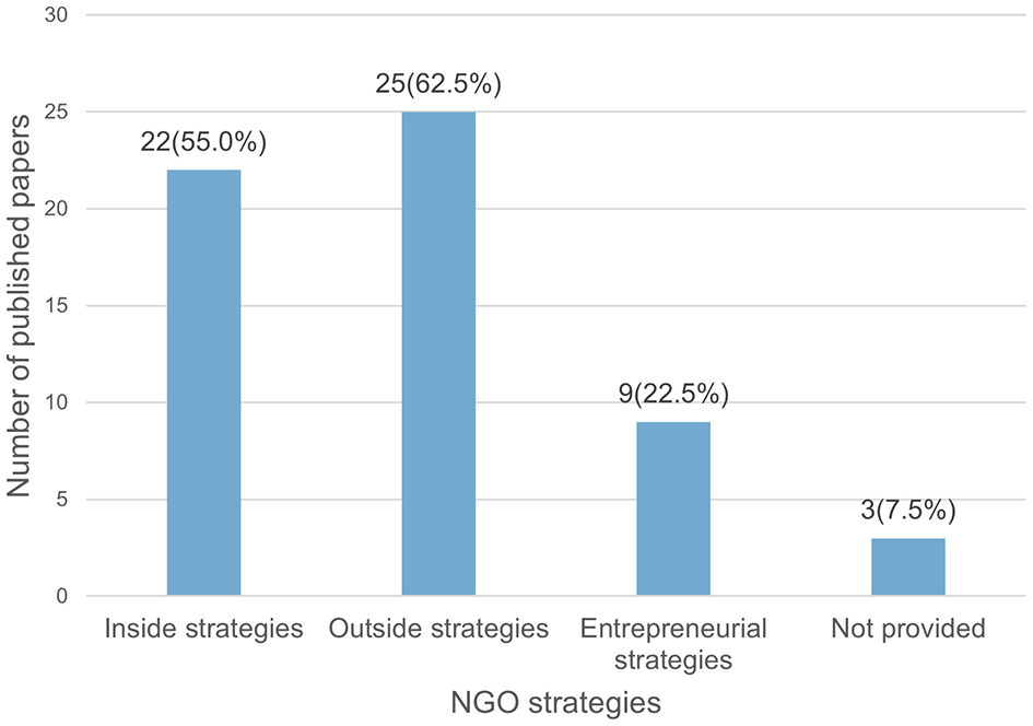 Among the three types of NGO strategies, outside strategies (62.5%) were adopted more often than inside strategies (55.0%; Figure 11). Outside strategies mainly focus on pressuring the government into action or inaction, through climate activism, naming and shaming, monitoring the actions of national and international institutions. One such example was Koliev et al.'s (2023) inquiry into how environmental NGOs chose their targets for climate shaming. In contrast, inside strategies involve direct engagement with decision-makers, including participating in policy-making processes, lobbying and partnering with government. For example, Chan (2021) analyzed how NGOs supported the operation of developing-country delegations by offering them specialized resources, training, and diplomatic advisory services. It indicates that NGOs are investing in direct policy engagement, seeking to shape climate governance not only from the margins but also from within the institutional arenas. Surprisingly, the entrepreneurial strategy was employed far less frequently, appearing in only 22.5% of the reviewed studies. Its relative infrequent use may be due to greater resource demands, risks, and specialized expertise required to devise and implement independent and innovative climate solutions.