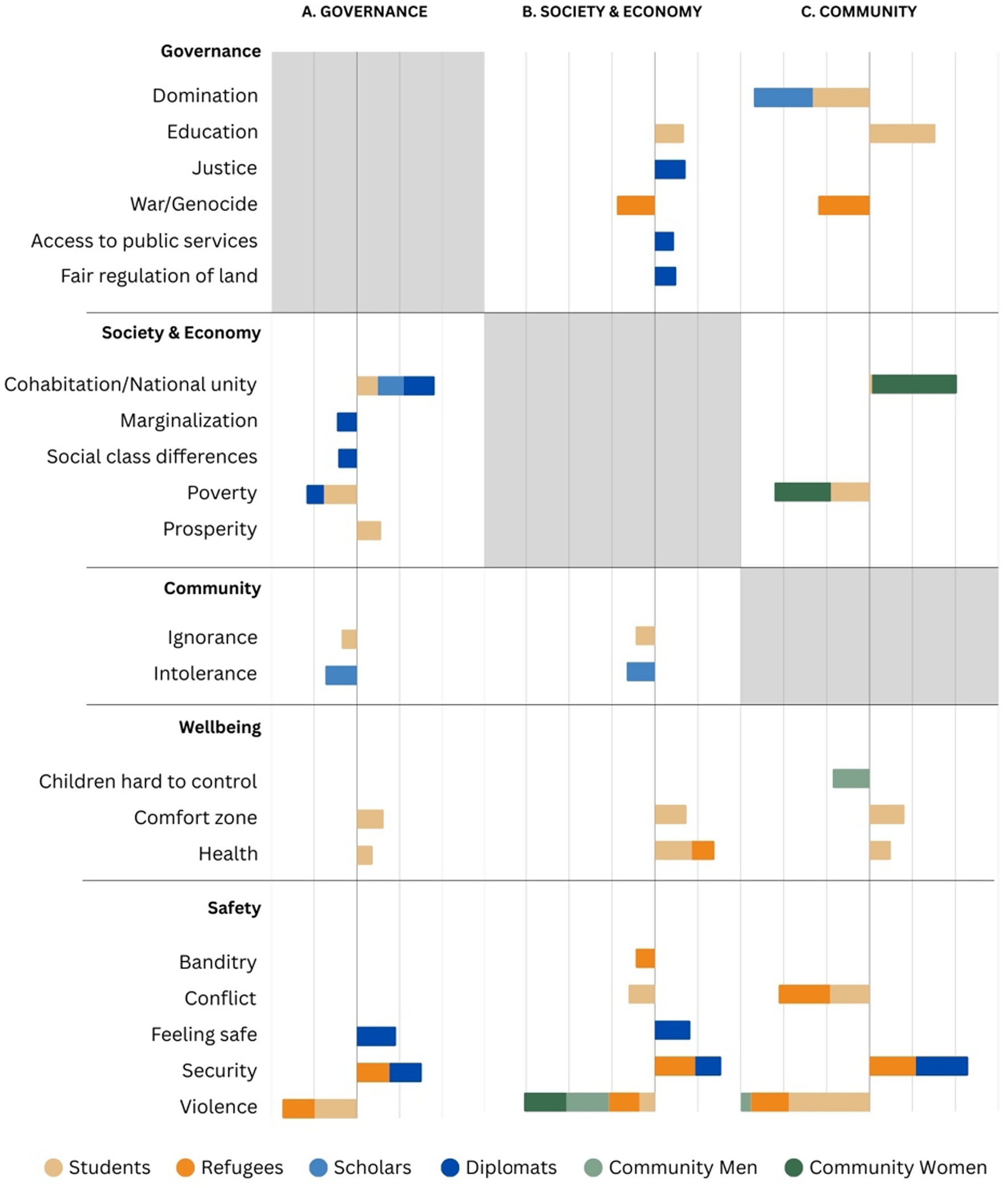 The maps thus reflect how different stakeholder groups positioned themselves visa vis the peace ecosystem. To facilitate inter-group comparison, we displayed our data on the number of driver variables across several domains of thematic interest (Figure 4, Table 3, step 2). For analytical purposes, we focused on five broad domains: (i) governance; (ii) society & economy; (iii) community; (iv) wellbeing; and (v) safety. Governance, for example, included the following variables: colonization, corruption, democracy, dominance/misuse of power, the education system, forced assimilation, the justice system, public services, regulation of land, regulation of migration, respect for human rights, social justice, transparency, and the waging of war/genocide. Figure 4 thus shows the alignment and/or divergence in stakeholder knowledge, with respect to how many variables were identified in each domain. We see that Mauritanian students, refugee students, scholars, and diplomats readily perceived the importance of governance-related factors, as directly connected to everyday peace. In stark contrast, community men and women did not.