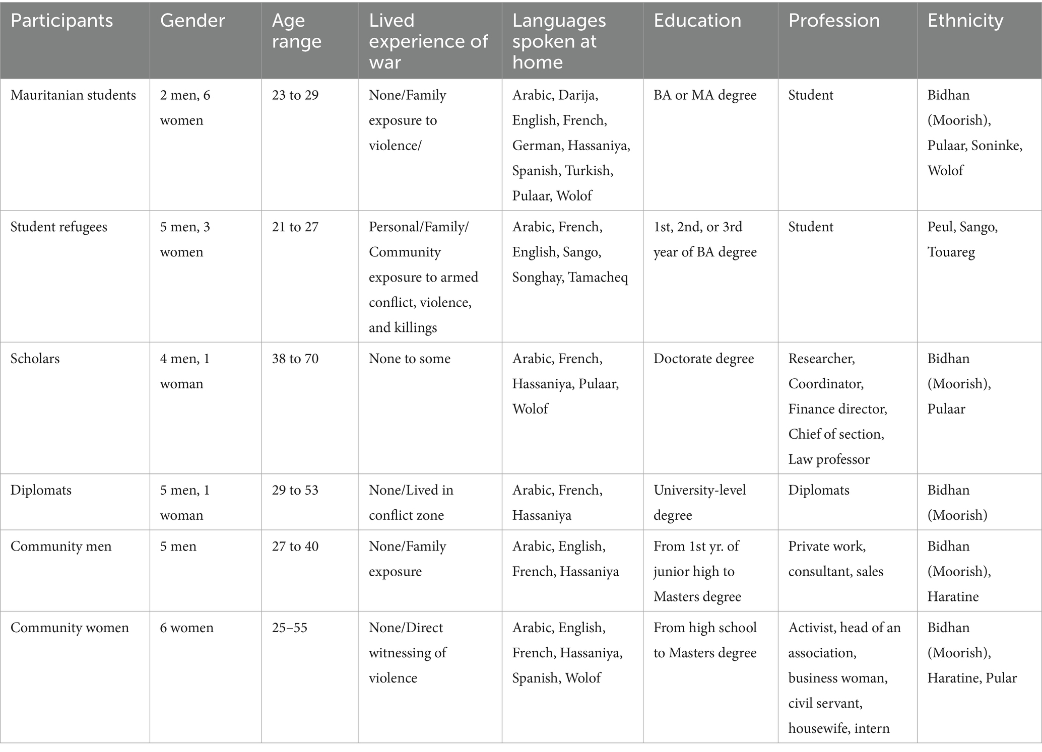 The six groups of respondents are shown in Table 2. While these groups do not capture statistically representative segments of the Mauritanian population, they do characterize a broad mosaic of society. Our respondents were linguistically very diverse. For example, Mauritanian students (group 1) spoke English, French, German, Hassaniya, Turkish, and/or Wolof, while community men and women (groups 5 and 6) spoke Arabic, Hassaniya, English, French, Wolof, and/or sign language. Indeed, it was only when the respondents introduced themselves, to each other, that a decision was made to have the group converse in either English (for Mauritanian students), French and Hassaniya (for refugees and scholars), or French, Hassaniya and Pulaar (for community men and women). With respect to education and social class, the students and professionals were fairly homogeneous groups, while ordinary citizens were more diverse: community men engaged in private work as cleaners, commerce, and/or research, with an education level that ranged from the first year of high school to graduate school, and community women described themselves as business people, civil activists, civil servants, interns, and/or housewives, with high school or graduate school degrees.