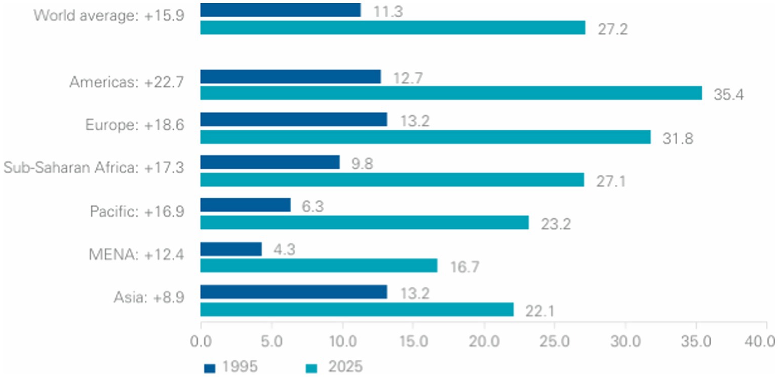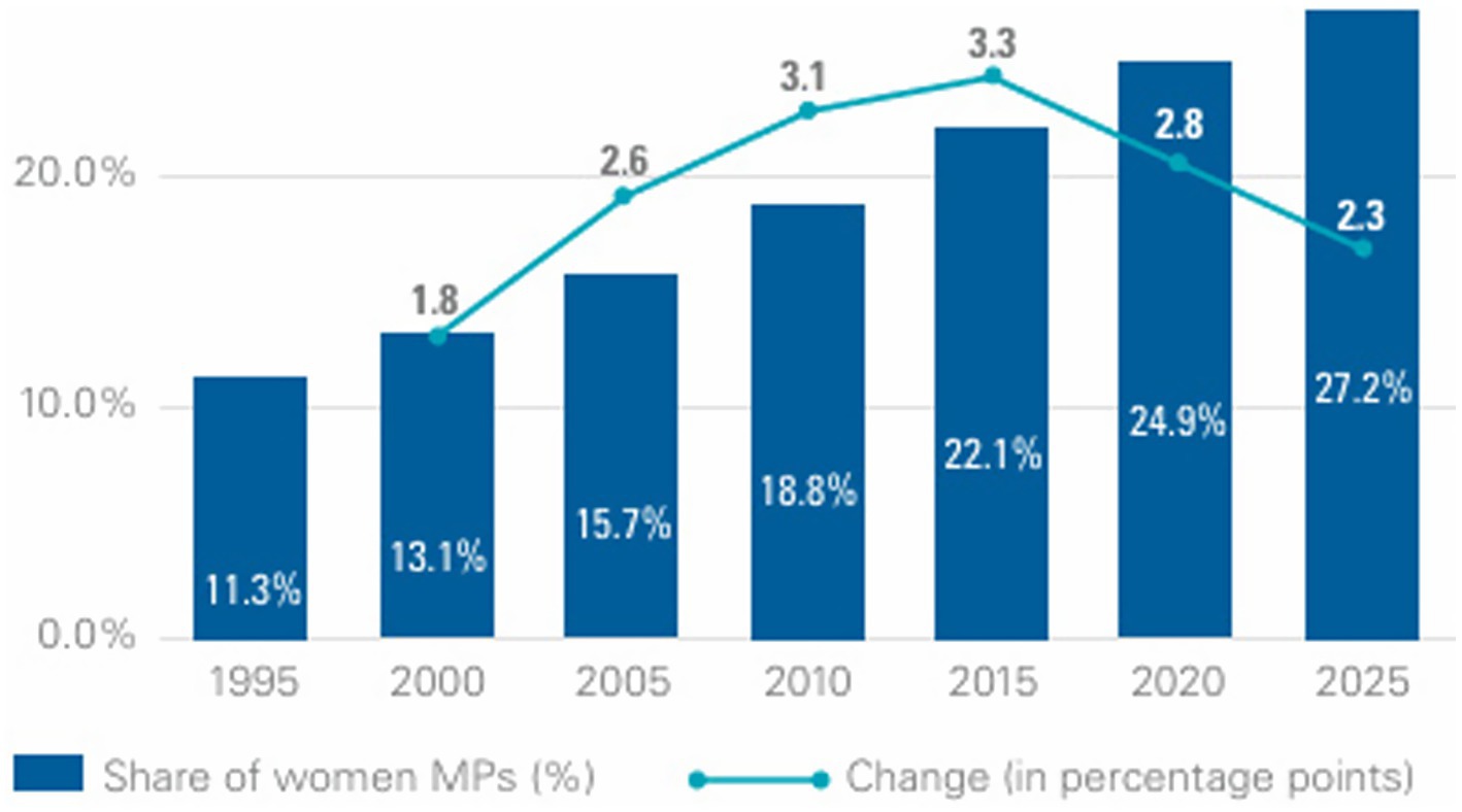 Figure 1. Women’s political participation in parliament: world averages 1995–2025. Source: Inter-Parliamentary Union (2025). Women in parliament: 1995–2025, reproduced with permission from Inter-Parliamentary Union, licensed under CC-BY-NC-SA 4.0.