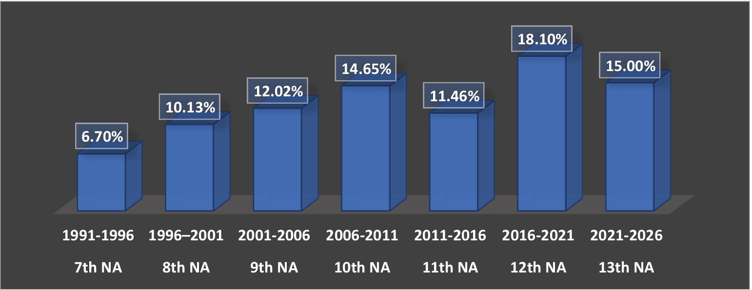The highest representation of women in parliament was achieved during the 2016–2021 term when women’s representation rose to 18.1% from 12.6% during the 2011–2016 national assembly (National Assembly of Zambia, 2017) as reflected in Figure 3.