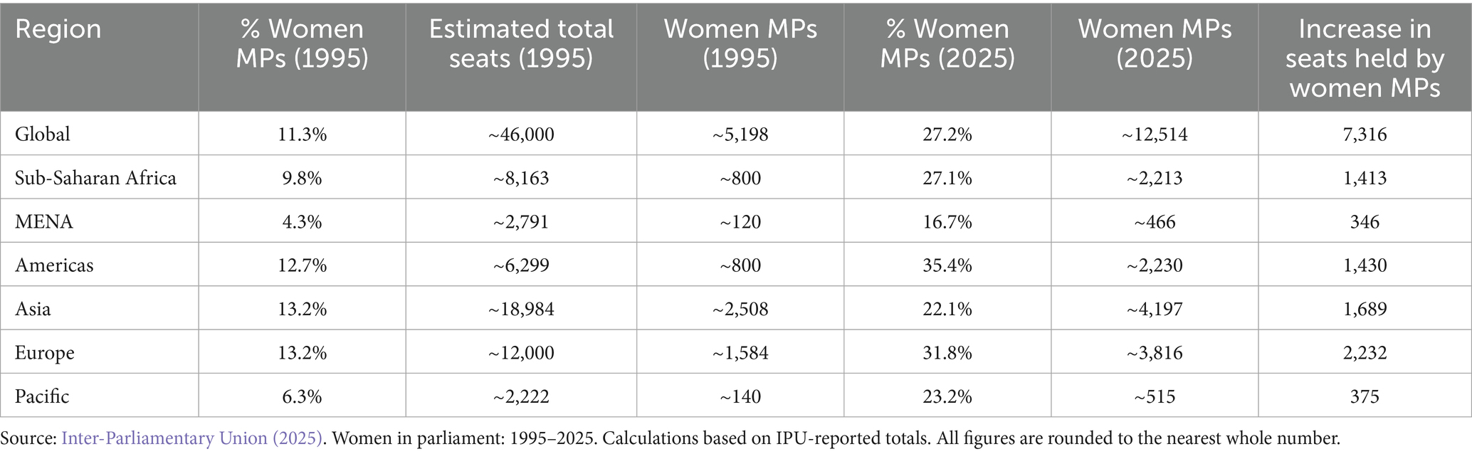 Figure 2. Women’s regional political participation: a comparison between 1995 and 2025. Source: Inter-Parliamentary Union (2025). Women in parliament: 1995–2025, reproduced with permission from Inter-Parliamentary Union, licensed under CC-BY-NC-SA 4.0.