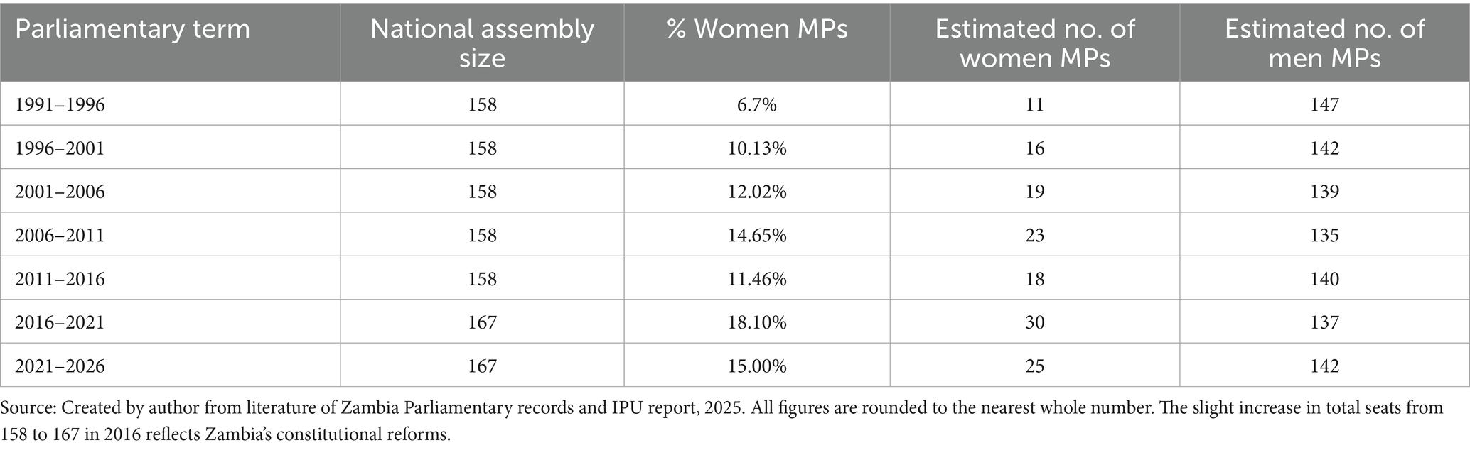 Figure 3. Parliamentary terms and percentage of women MPs, Zambia. Source: Created by author from literature of Zambia Parliamentary records and IPU report, 2025.