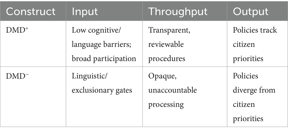 DMD+ is present where (i) input legitimacy shows inclusive rule-making access (e.g., language-accessible ballots, low barriers to petitioning), (ii) throughput legitimacy shows transparent, contestable procedures (open committee hearings, reasons-giving), and (iii) output legitimacy shows policy responsiveness to median citizen preferences. DMD− is present where these three channels are structurally compromised or blocked (Scharpf, 2009; Schmidt, 2013). Unlike neopatrimonialism, which explains rule via personalized exchange and informalization (Bratton and Van de Walle, 1997; Chabal and Daloz, 1999), DMD− is a relational outcome. It is the structural disabling of citizens’ democratic agency even where elections are present. Patron-client ties can be carriers of DMD−, but DMD− centres on compromised input-throughput-output channels rather than on patronage per se.