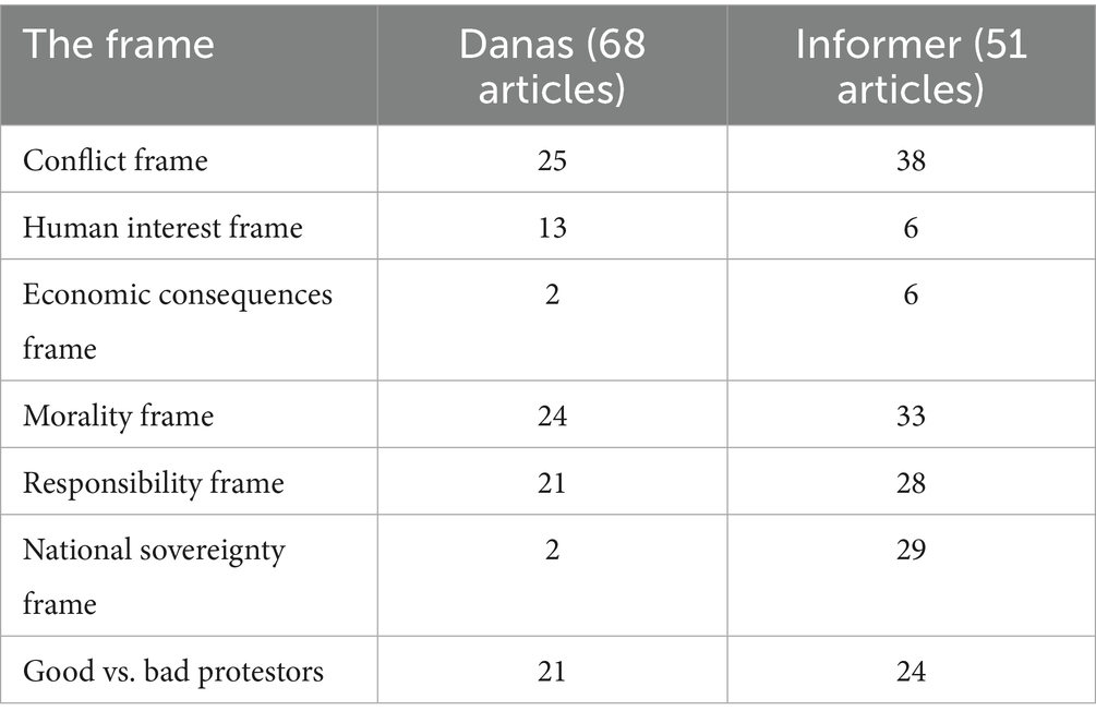 In this analysis, the author seeks to identify the presence of seven specific frames in two newspapers and examine their application through the lens of the protest paradigm, with the aim of uncovering underlying media matrices. This study uses a deductive framing approach but, it will combine frames from appropriate research (Muncie, 2020; Papaioannou, 2020; Mourão, 2019; Tomanić Trivundža and Slaček Brlek, 2017; Semetko and Valkenburg, 2000). Drawing on Entman’s (1993) conceptualization, framing is understood as the process of selecting and emphasizing certain aspects of a perceived reality to promote specific problem definitions, causal interpretations, moral evaluations, and treatment recommendations. In addition to Entman’s model, the study incorporates insights from complementary research to underscore the significance of protester perception as a key indicator of media polarization. The analysis applies a range of broad, generic frames listed in five frames—attribution of responsibility, conflict, human interest, economic consequences, and morality—derived from Semetko and Valkenburg (2000). According to these authors, the frames are explained as: conflict frame—emphasizes conflict between individuals, groups, or institutions as a means of capturing audience interest; human interest frame—brings a human face or an emotional angle to the presentation of an event, issue, or problem; economic consequences frame—reports an event, problem, or issue in terms of the consequences it will have economically on an individual, group, institution, region, or country; morality frame—puts the event, problem, or issue in the context of religious tenets or moral prescriptions; responsibility frame—presents an issue or problem in such a way as to attribute responsibility for its cause or solution to either the government or to an individual or group (Semetko and Valkenburg, 2000, pp. 94–95).