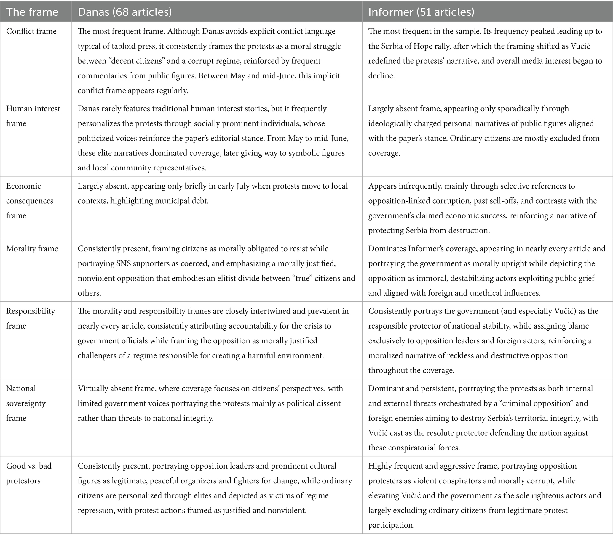 Economics did not emerge as a prominent frame in either paper, while the morality frame was present in both: in Danas, through the opposition’s struggle representing citizens against repressive authorities; and in Informer, conversely, through the government’s responsibility to protect the state and citizens from a violent and irresponsible opposition. Consequently, responsibility is divided oppositely in the two papers—Danas assigns sole responsibility for violence and citizen dissatisfaction to the government, while Informer credits the government for peace and stability and blames the opposition for violence and destabilization. The national security frame is addressed exclusively by Informer, portraying protests as a “colored revolution” aimed at destabilizing the country and overthrowing the constitutional order. Danas almost entirely avoids this frame.