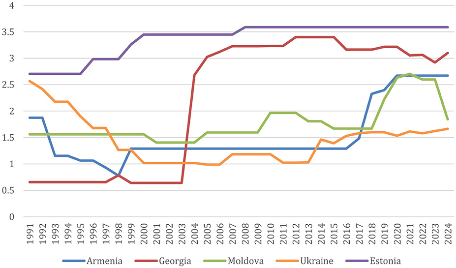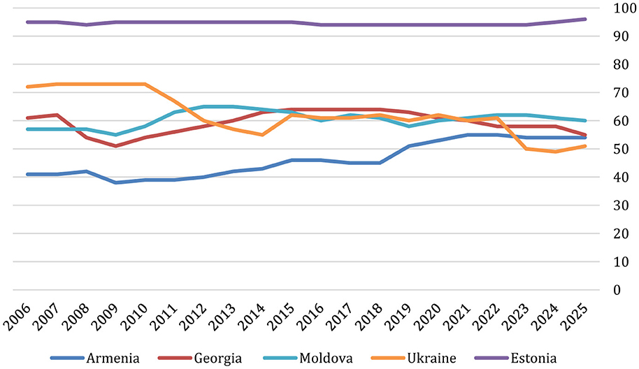At a time of global democratic retreat, Armenia is among the few countries that registered some democratic progress after 2018. Figure 1 depicts Freedom House Freedom in the World Scores for Armenia and three other post-Soviet countries that experienced similar popular uprisings: Georgia, Moldova and Ukraine. Estonia is also plotted on this and subsequent graphs as an example of a successful post-Soviet democratiser. Figure 1 shows an increase in freedom in Armenia after 2018 (from 41 to 51 and later to 55 in 2022), which afterwards slightly decreases (from 55 to 54 in 2023–2025). In the Freedom House Nations in Transit 2024 Report Armenia's National Democratic Governance rating fell from 2.50 to 2.25, reflecting “the executive's consolidation of power, the multiyear trend of central authorities overreaching …, and the lack of transparency in ruling party finances” (Freedom House, 2024). V-Dem five types of democracy indexes, depicted in Figure 2, increase in the aftermath of the 2018 Velvet Revolution but start declining after that.