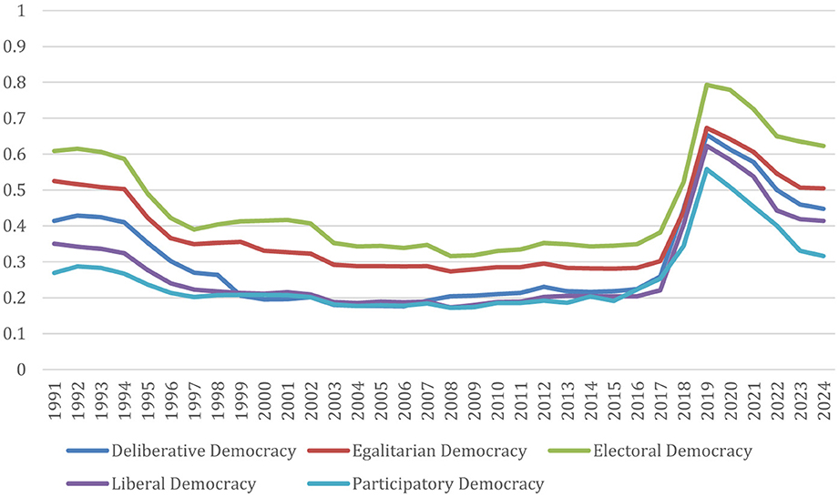 Figure 2. V-Dem democracy indexes (0–1 hight). Source: https://v-dem.net/data_analysis/CountryGraph/.