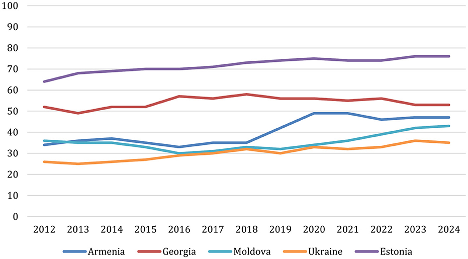Figure 4. Transparency International corruption perception index (0–100 no corruption). Source: https://www.transparency.org/en/cpi/2024.