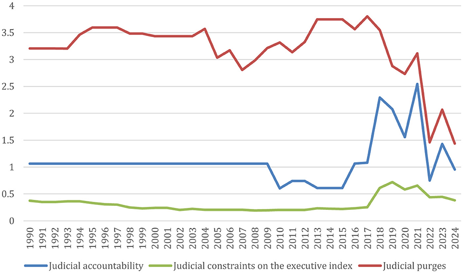 Figure 6. V-Dem judicial corruption decision (0–4 never making corruption-induced decisions). Source: https://v-dem.net/data_analysis/VariableGraph/.