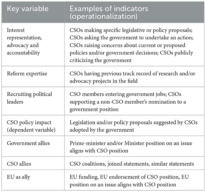 Our inability to secure an interview with an EU representative is a major limitation of this research. The position and the influence of the EU—one of the key allies in our theoretical framework—is captured indirectly through interviews with other stakeholders and analysis of reform-related documents. Conducting only eight interviews is a limitation as well. We miss some potentially important perspectives of those who did not respond to our multiple interview requests. Moreover, our operationalization of key variables is far from comprehensive. Much of it was derived inductively from the data in the process of analyzing the cases, as an open endeavor of trying to make sense of a complex and messy policy process. A more rigorous and detailed conceptualization and operationalization of variables, and inclusion of other key variables we probably overlooked, would certainly result in a deeper and more accurate understanding of CSO influence on post-revolutionary policy processes. Our work remains largely exploratory and descriptive. We hope the themes we explore and the questions we leave unanswered would lead to further, more informed analysis.