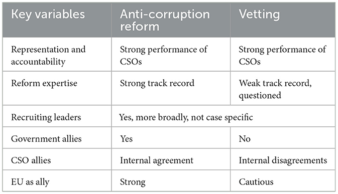 Comparing the two cases, we can see the differences in some of the elements analyzed, as depicted in Table 2. It seems that CSOs were better positioned to influence the anti-corruption reform, as compared to the vetting reform, given their stronger reform expertise track record, alignment with government priorities, internal coordination and support from the EU. While we cannot claim that these exact factors fully explain the relative success of the anti-corruption reform, these findings align with the actual reform outcomes. We have clear evidence of CSO proposals being accepted and an overall quantitative indications of anti-corruption progress in the country, as discussed above.