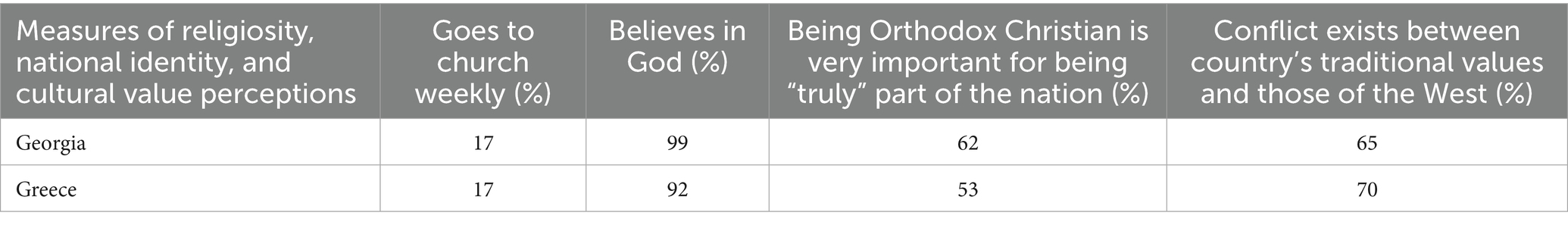 Table 2. Belief versus behavioral patterns, markers of national identity and cultural conservatism in Greece and Georgia (Pew Research Center data, 2017).