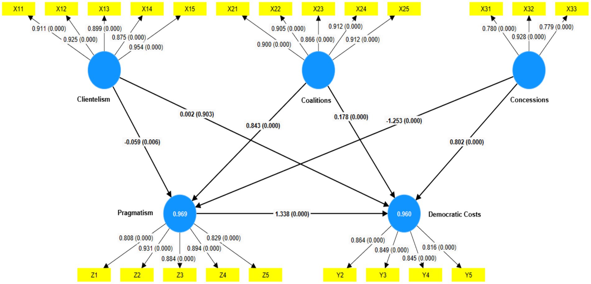 Results: Clientelism does not directly affect democratic costs but has an indirect effect via political pragmatism. Coalitions reduce democratic costs. Concessions increase democratic costs both directly and indirectly. Pragmatism significantly predicts democratic costs. Measurement indices met conventional thresholds.
