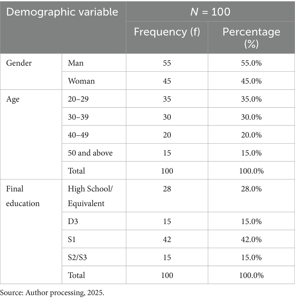 Demographic characteristics such as age and education level can influence a person’s political participation tendencies and electoral choice patterns (Gallego and Oberski, 2021). Therefore, understanding the demographic composition of respondents is the initial foundation in interpreting the relationship between the main variables in the study (Coppedge et al., 2022).